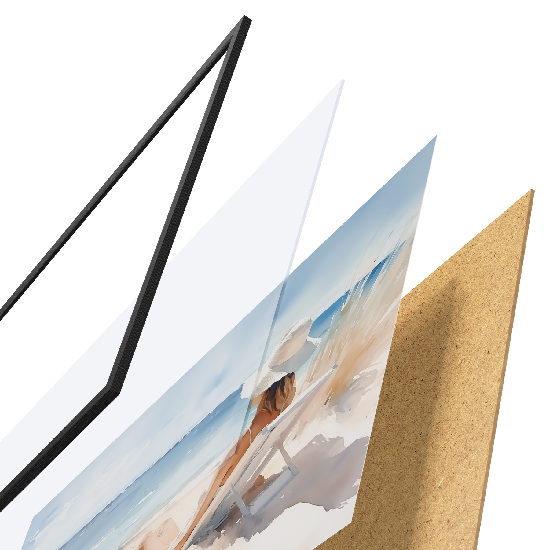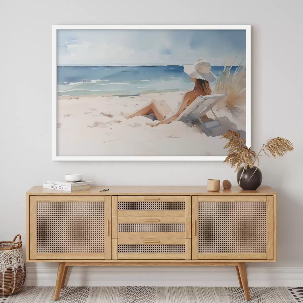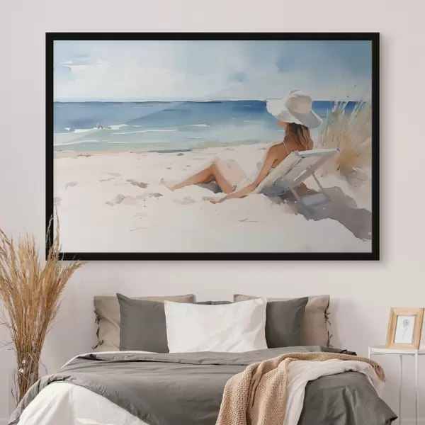 Plakatas Mergina atsipalaidavusi paplūdimyje prie jūros akvarelė f40679