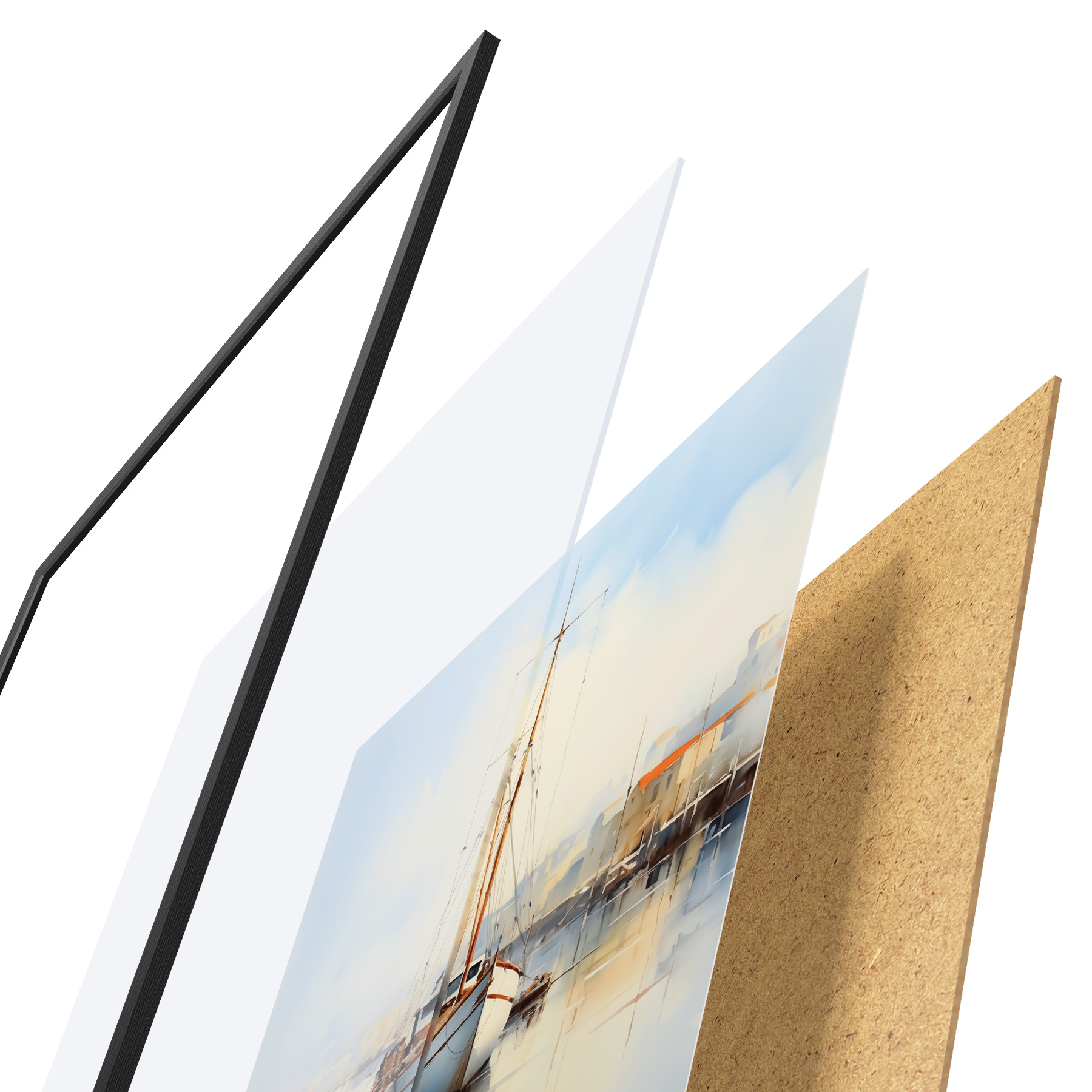Plakatą sudaro rėmas, pleksiklas, atspausdintas vaizdas ir medžio drožlių plokštės pagrindas. Plakatą galima iš karto pakabinti ant sienos dėl kitoje pusėje esančių laikiklių.