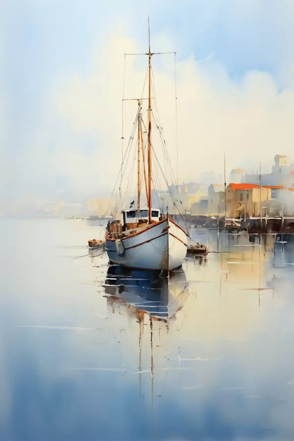 Plakatas Žvejybos laivas prieplaukoje prie jūros šlapia akvarelė f40688