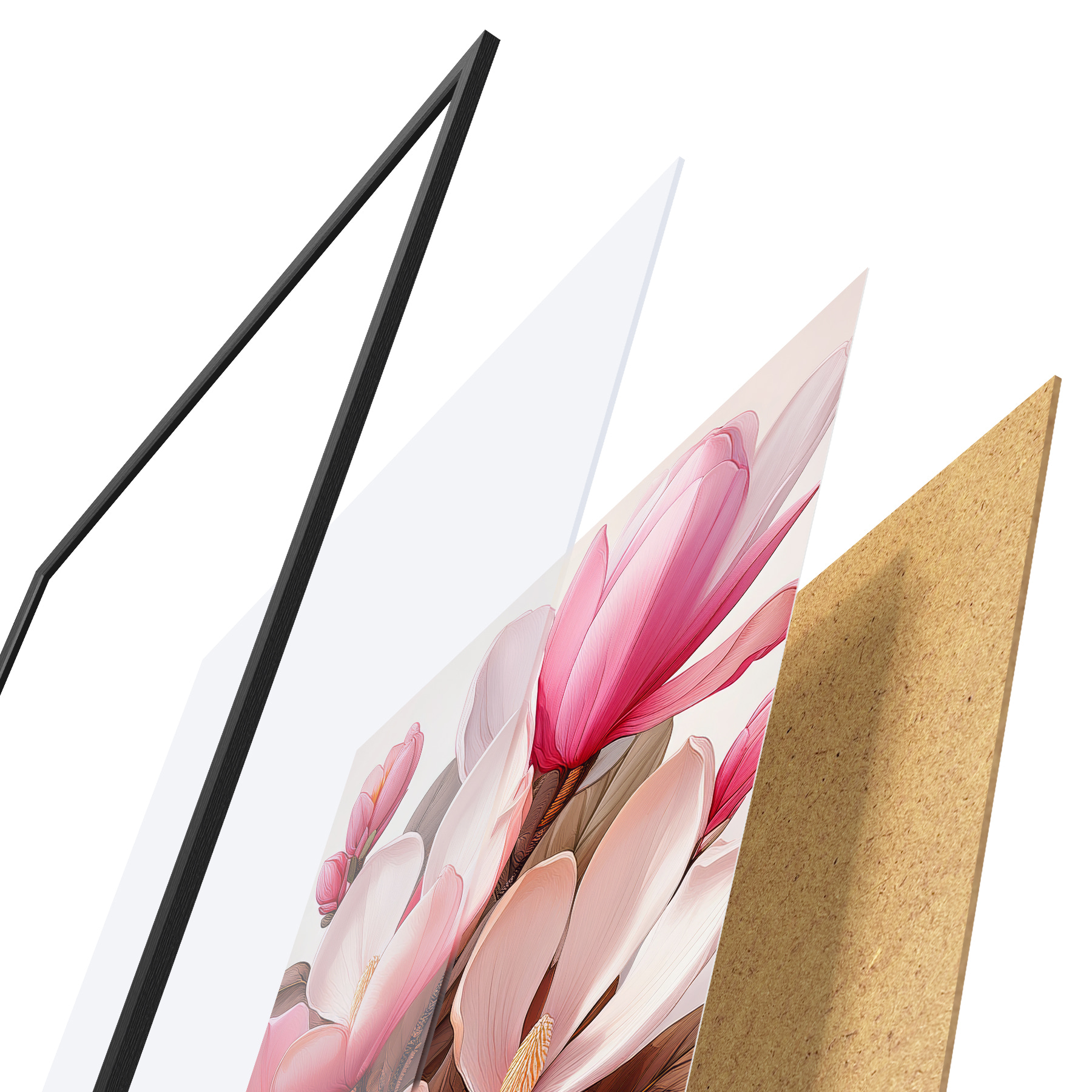 Plakatą sudaro rėmas, pleksiklas, atspausdintas vaizdas ir medžio drožlių plokštės pagrindas. Plakatą galima iš karto pakabinti ant sienos dėl kitoje pusėje esančių laikiklių.
