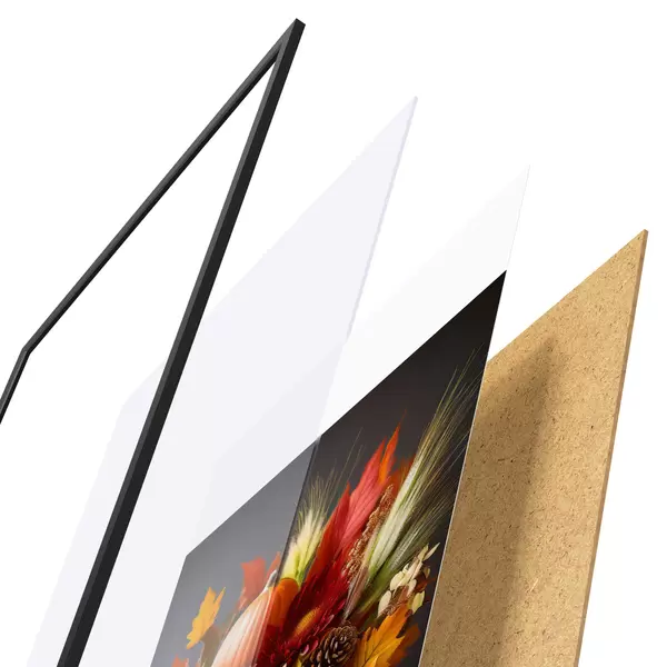 Plakatą sudaro rėmas, pleksiklas, atspausdintas vaizdas ir medžio drožlių plokštės pagrindas. Plakatą galima iš karto pakabinti ant sienos dėl kitoje pusėje esančių laikiklių.