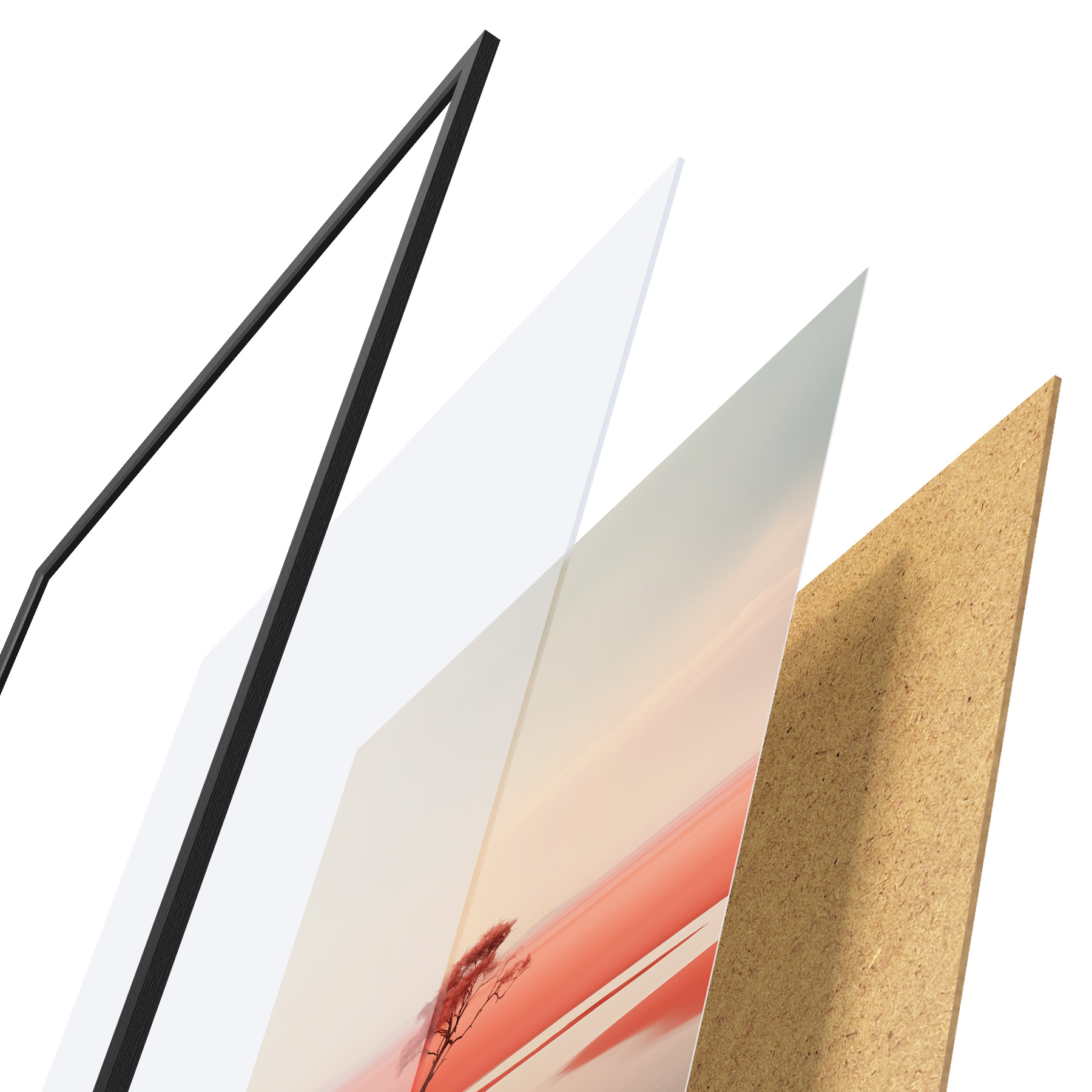 Plakatą sudaro rėmas, pleksiklas, atspausdintas vaizdas ir medžio drožlių plokštės pagrindas. Plakatą galima iš karto pakabinti ant sienos dėl kitoje pusėje esančių laikiklių.