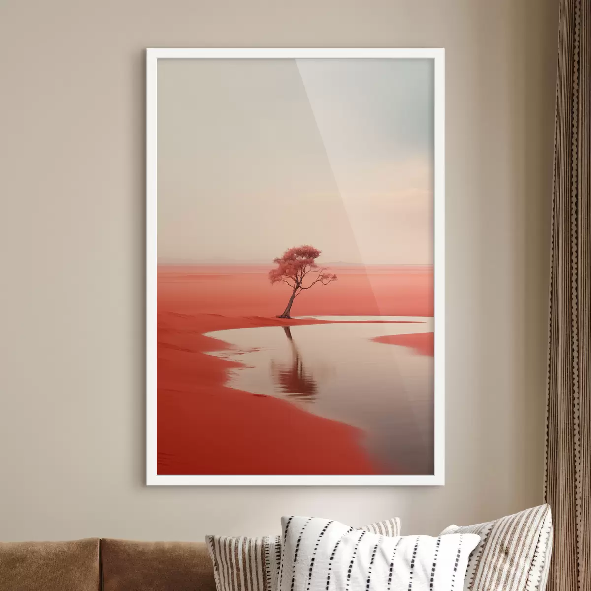 Plakatas Minimalistinis kraštovaizdžio medis prie upės, raudona, pilka spalva f40722