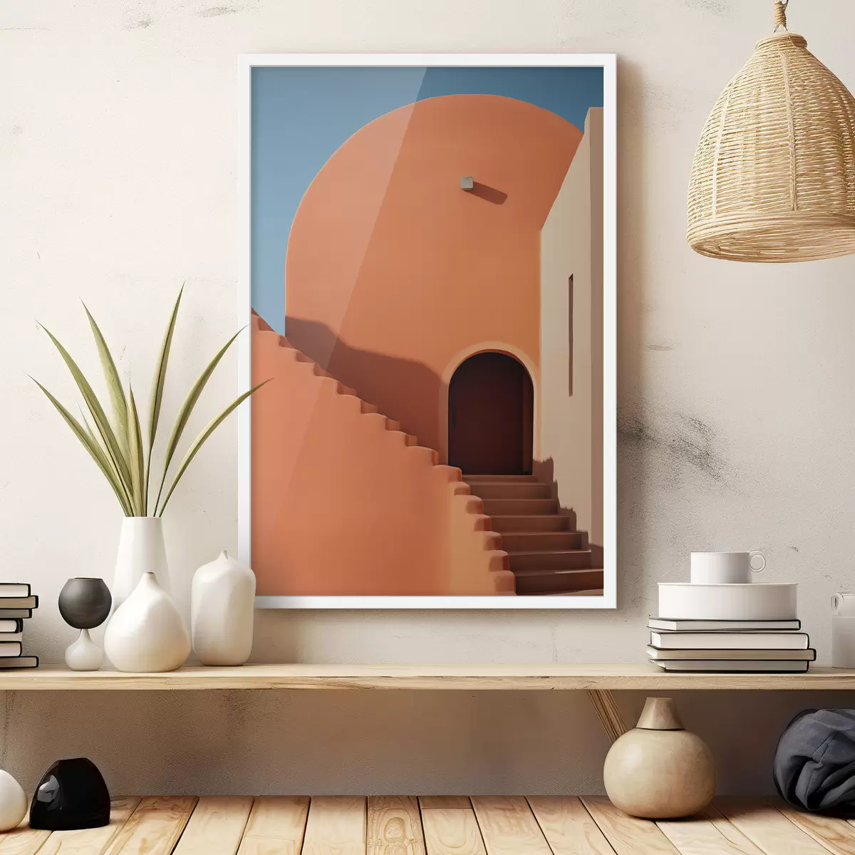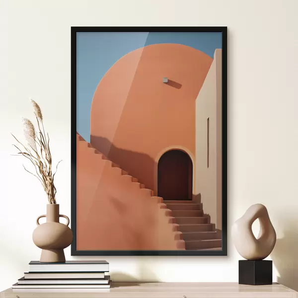 Plakatas Minimalistinės architektūros pastatas su laipteliais, mėlyna, oranžinė spalva Ne f40724