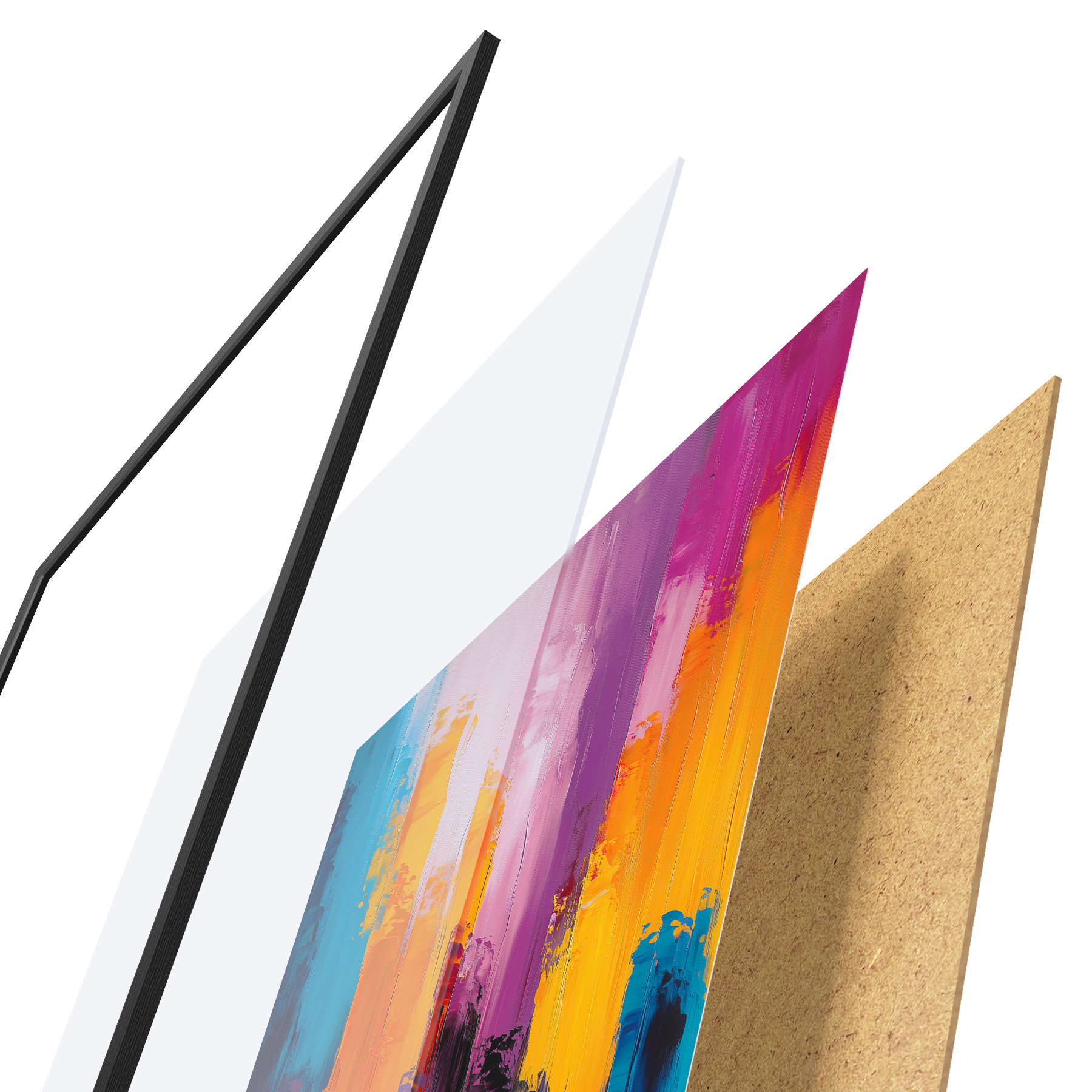 Plakatą sudaro rėmas, pleksiklas, atspausdintas vaizdas ir medžio drožlių plokštės pagrindas. Plakatą galima iš karto pakabinti ant sienos dėl kitoje pusėje esančių laikiklių.