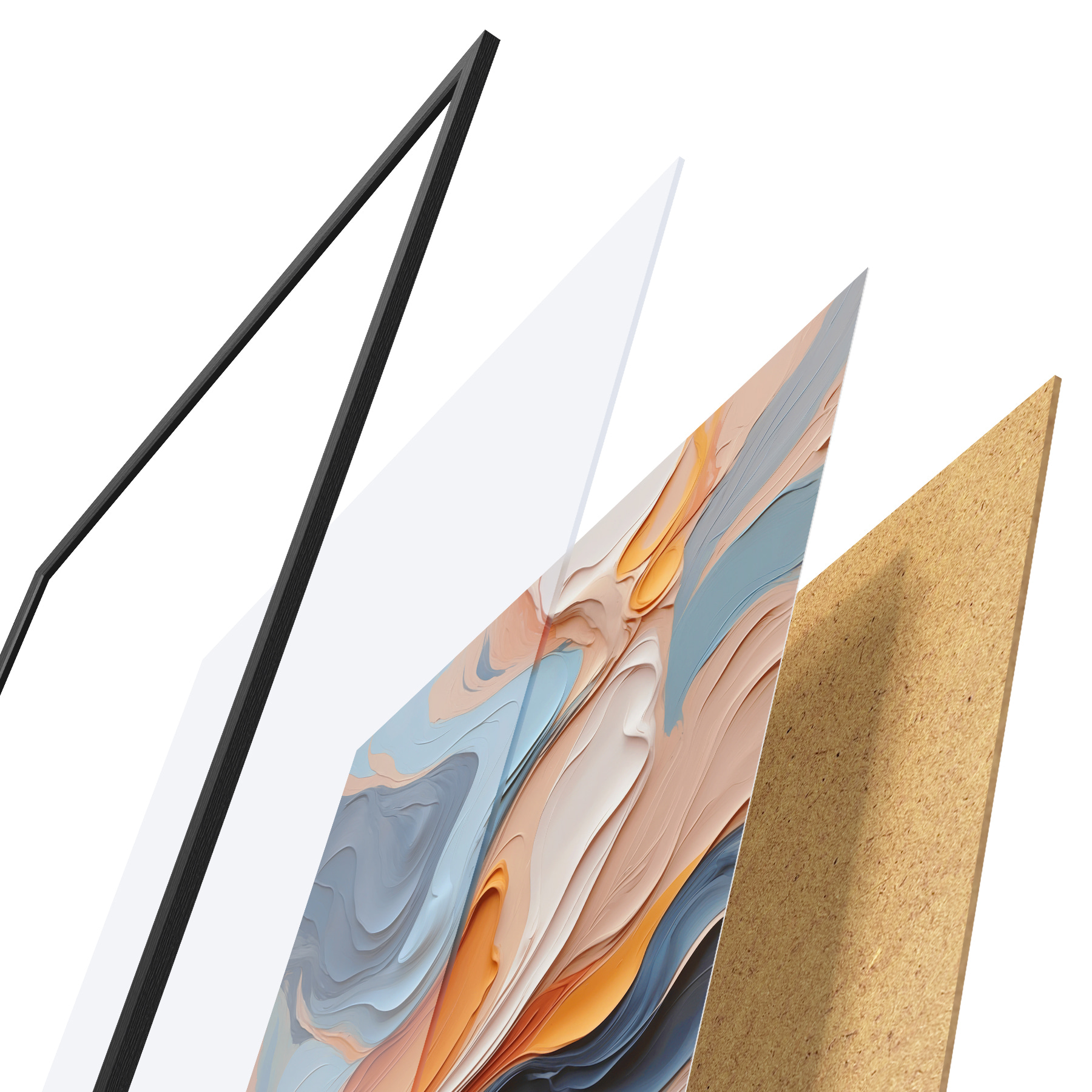 Plakatą sudaro rėmas, pleksiklas, atspausdintas vaizdas ir medžio drožlių plokštės pagrindas. Plakatą galima iš karto pakabinti ant sienos dėl kitoje pusėje esančių laikiklių.