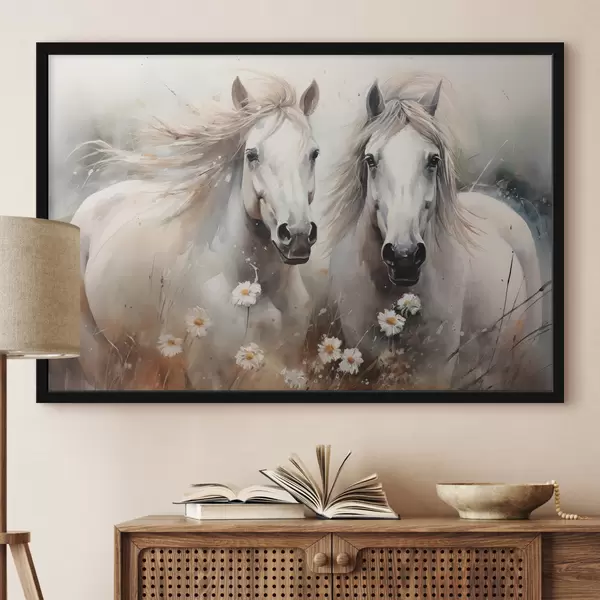 Plakatas Pora baltų ir pilkų žirgų prie margučių Ne f40749