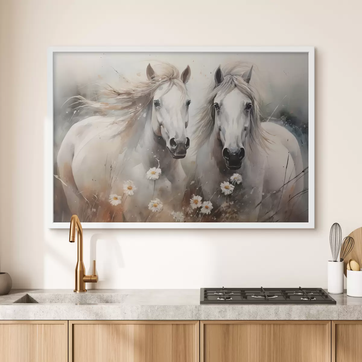 Plakatas Pora baltų ir pilkų žirgų prie margučių f40749