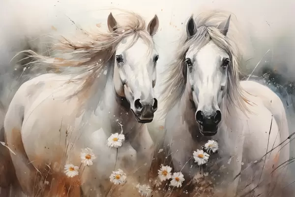 Plakatas Pora baltų ir pilkų žirgų prie margučių f40749