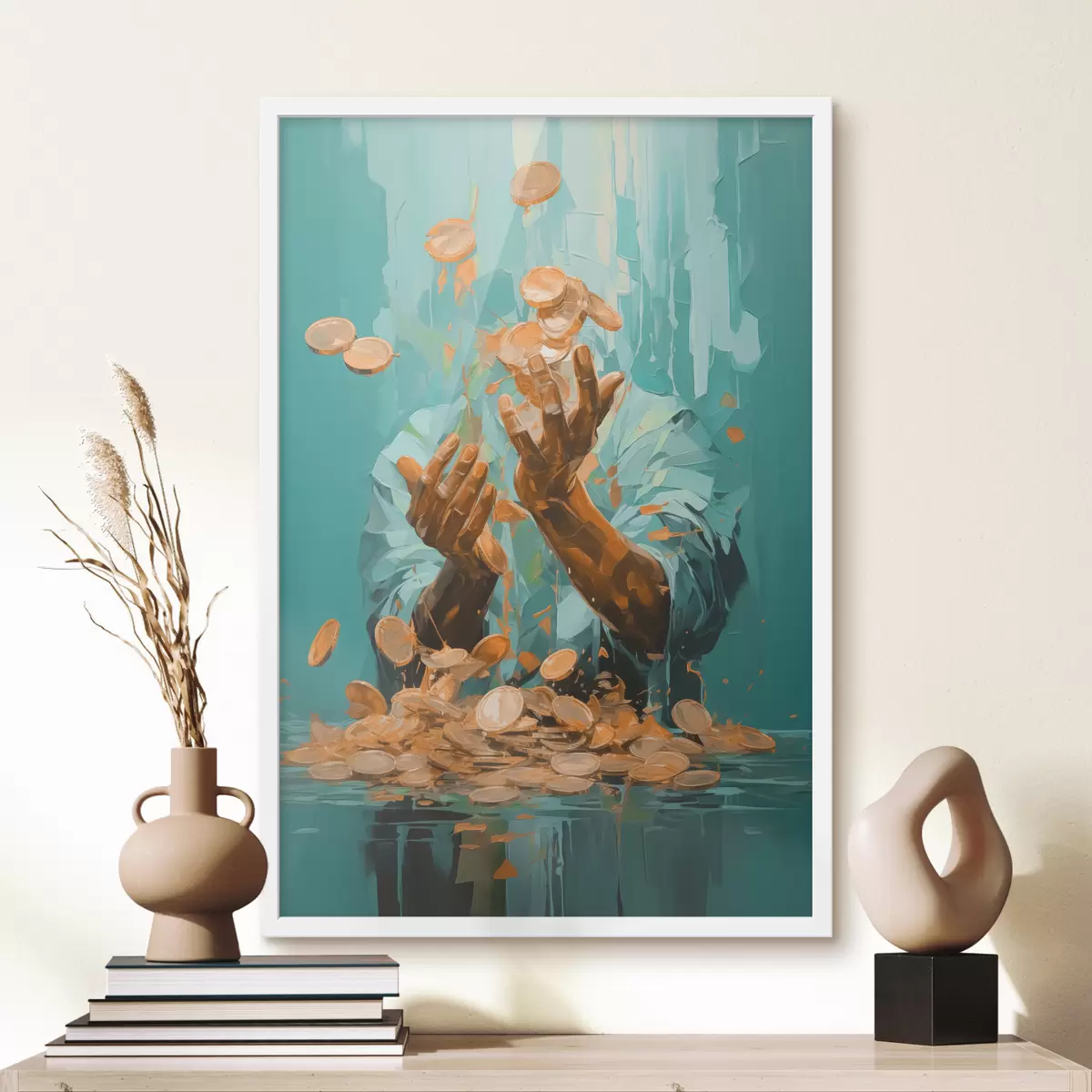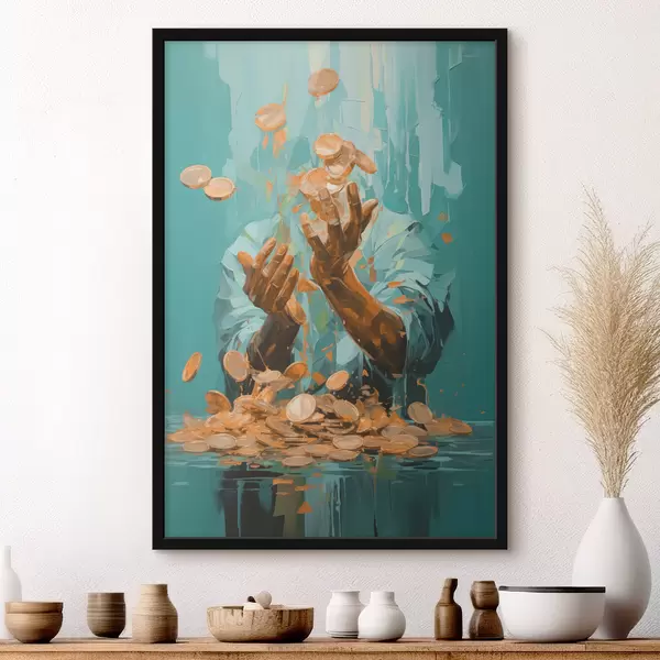 Plakatas Abstraktus paveikslas, vaizduojantis vyrą, apsuptą auksinių monetų f40755