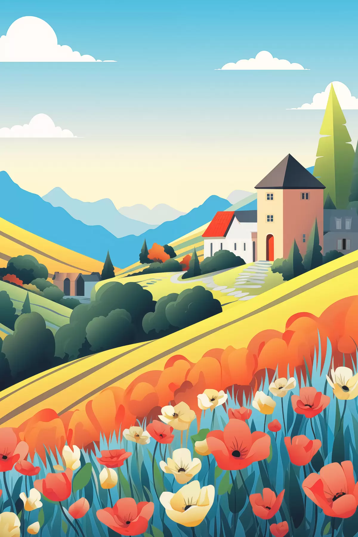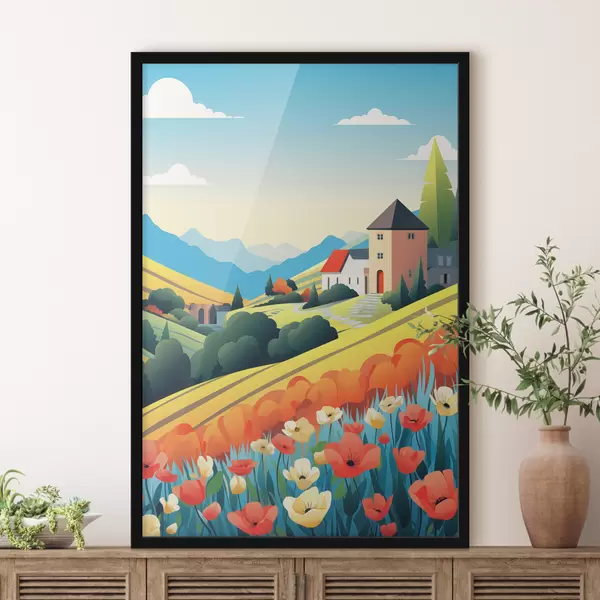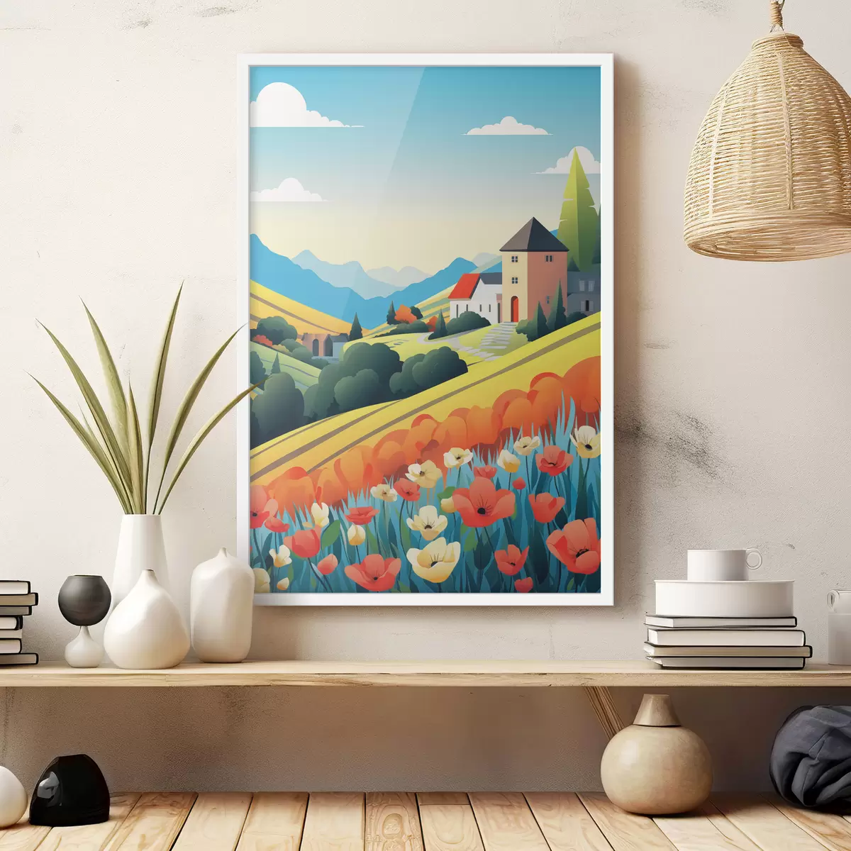 Plakatas Šviesus kaimo kraštovaizdis su lauku, aguonomis ir namais f40756
