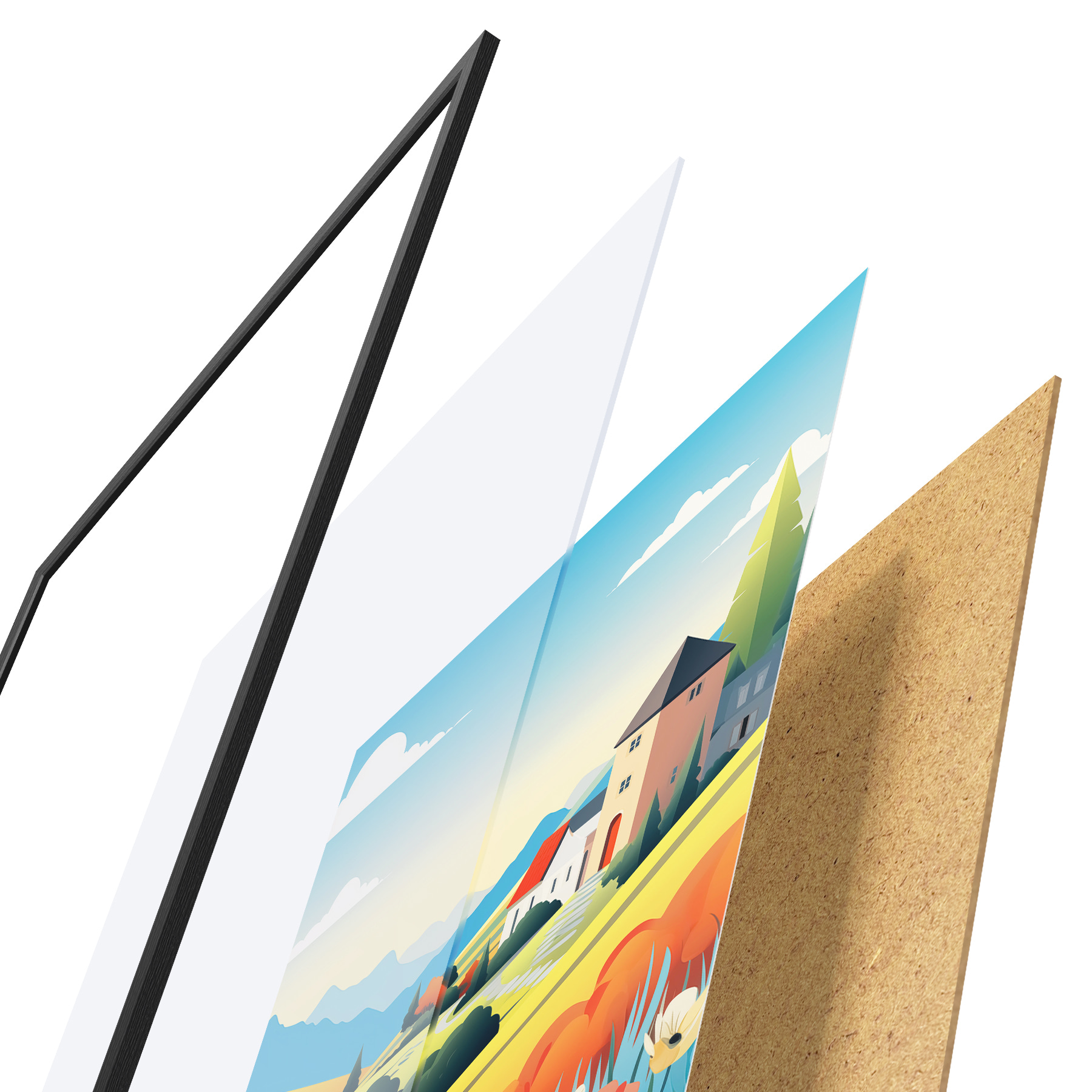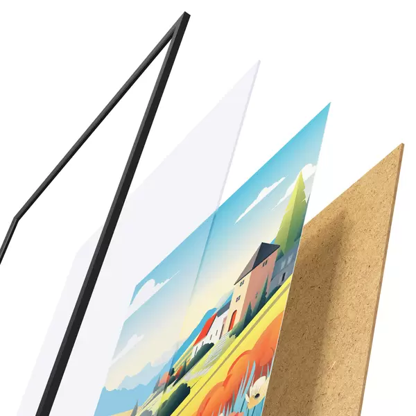 Plakatą sudaro rėmas, pleksiklas, atspausdintas vaizdas ir medžio drožlių plokštės pagrindas. Plakatą galima iš karto pakabinti ant sienos dėl kitoje pusėje esančių laikiklių.