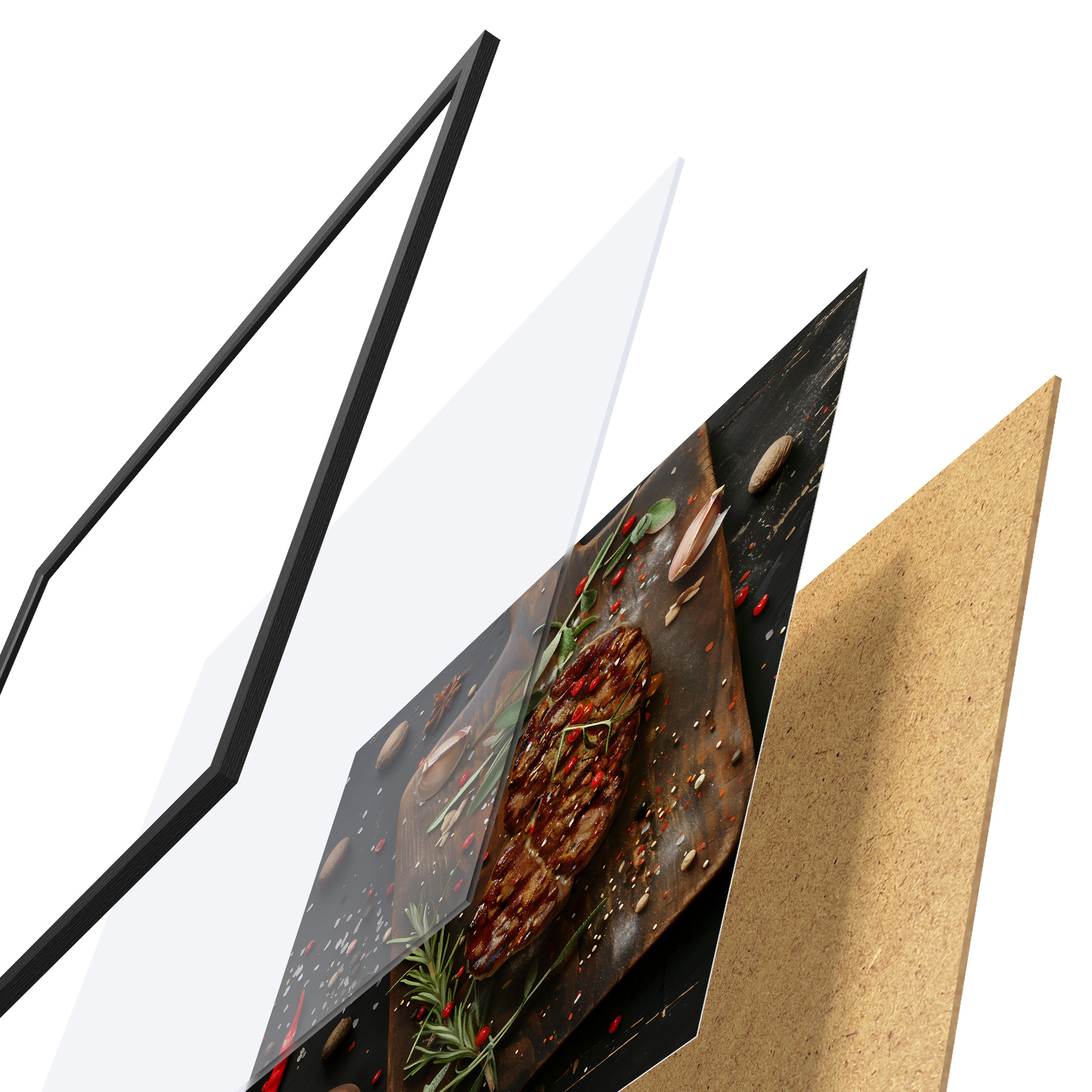 Plakatą sudaro rėmas, pleksiklas, atspausdintas vaizdas ir medžio drožlių plokštės pagrindas. Plakatą galima iš karto pakabinti ant sienos dėl kitoje pusėje esančių laikiklių.