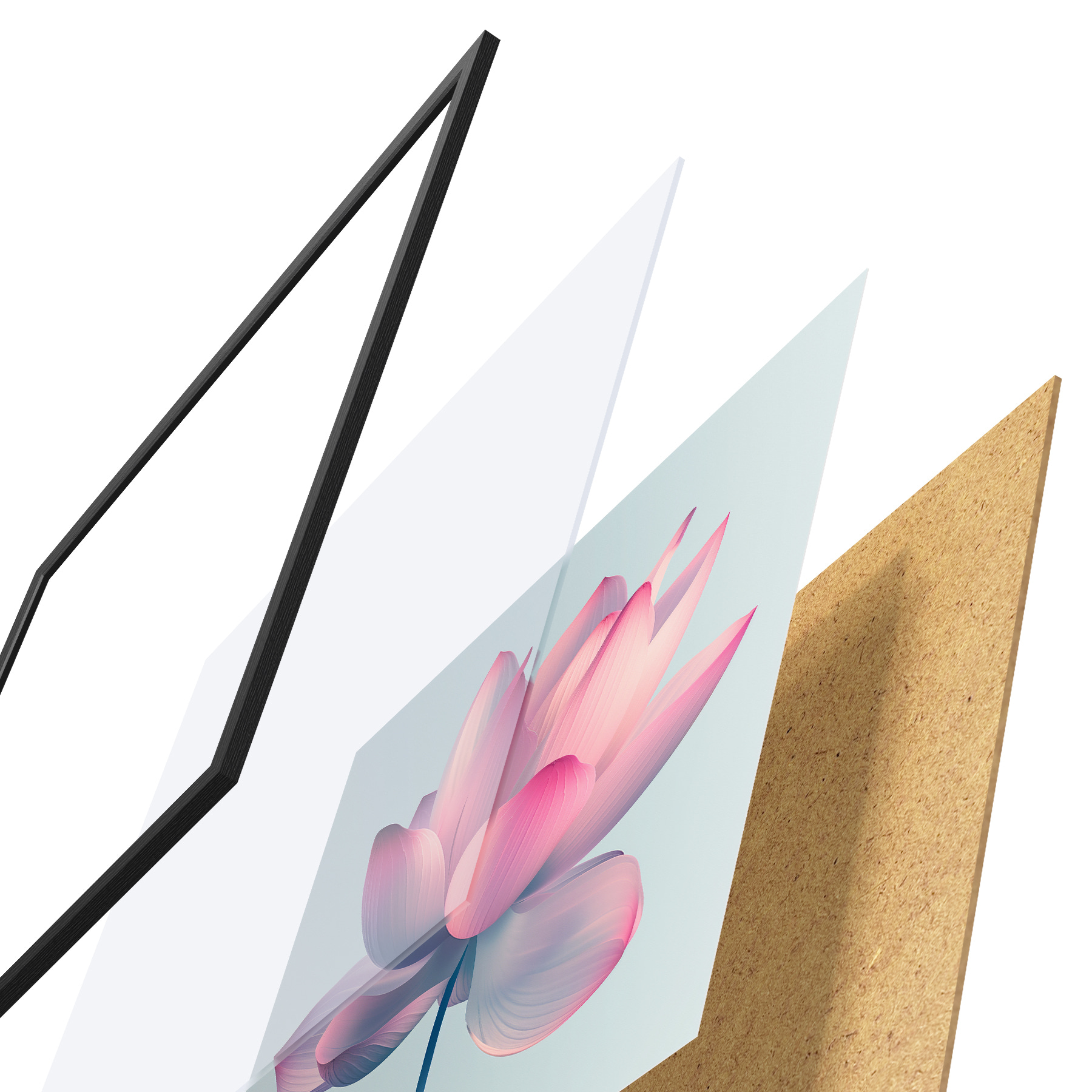 Plakatą sudaro rėmas, pleksiklas, atspausdintas vaizdas ir medžio drožlių plokštės pagrindas. Plakatą galima iš karto pakabinti ant sienos dėl kitoje pusėje esančių laikiklių.