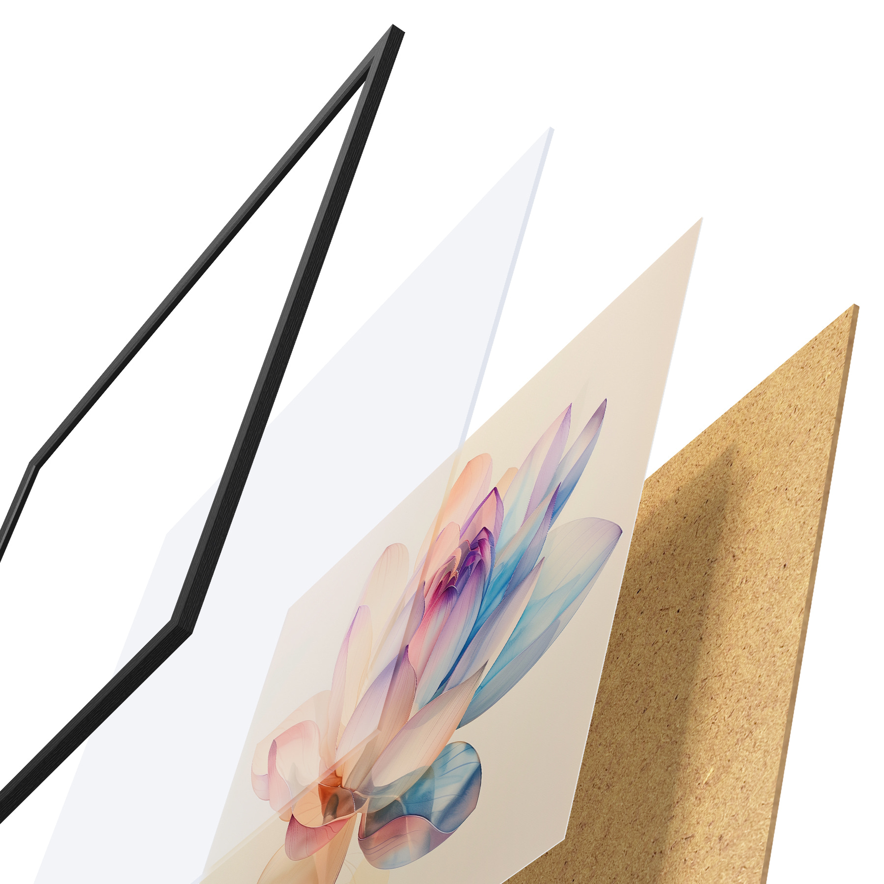 Plakatą sudaro rėmas, pleksiklas, atspausdintas vaizdas ir medžio drožlių plokštės pagrindas. Plakatą galima iš karto pakabinti ant sienos dėl kitoje pusėje esančių laikiklių.