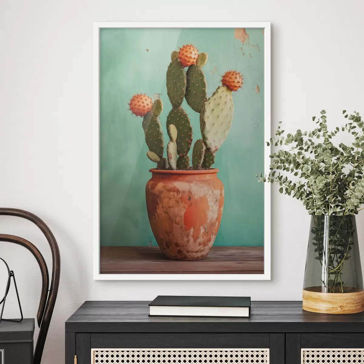 Plakatas Kaktusas sename moliniame vazone ant mėlynai žalios sienos f40807
