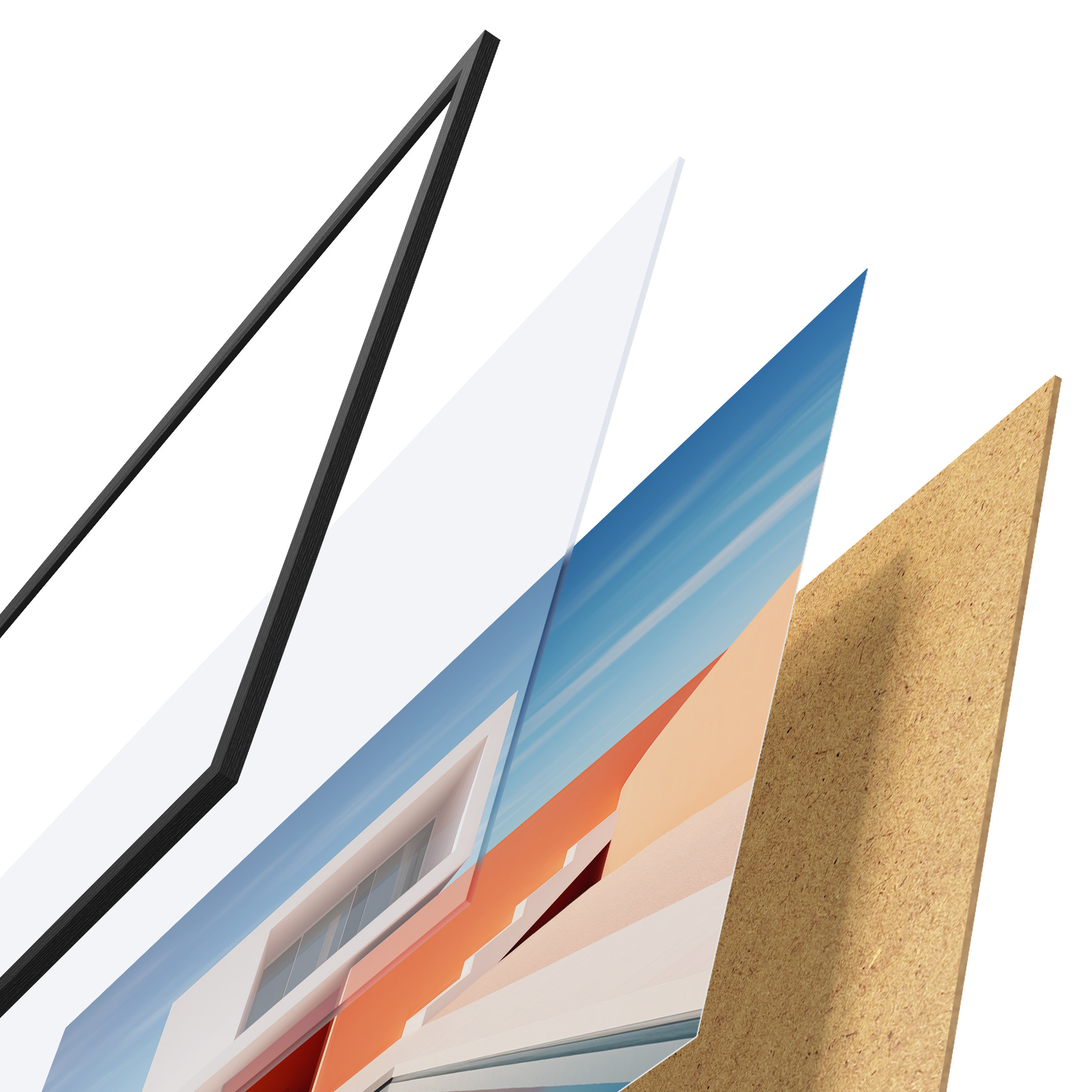 Plakatą sudaro rėmas, pleksiklas, atspausdintas vaizdas ir medžio drožlių plokštės pagrindas. Plakatą galima iš karto pakabinti ant sienos dėl kitoje pusėje esančių laikiklių.