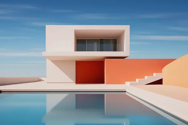 Plakatas Minimalistinės architektūros kraštovaizdis, namas ir baseinas f40811