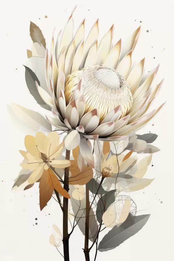 Plakatas Gražios protea gėlės su vešliais lapais, švelnios smėlio spalvos, medvilnė f40817