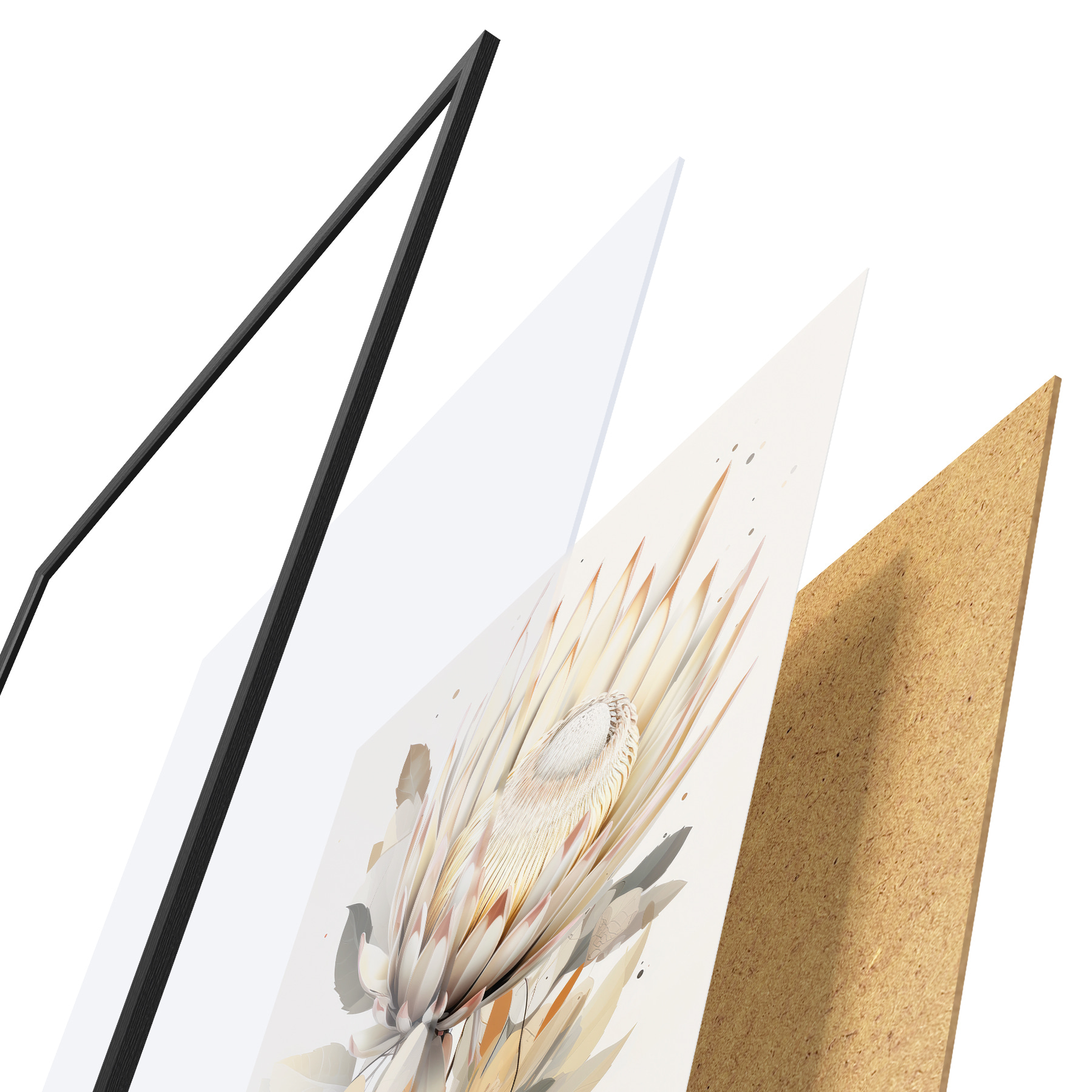 Plakatą sudaro rėmas, pleksiklas, atspausdintas vaizdas ir medžio drožlių plokštės pagrindas. Plakatą galima iš karto pakabinti ant sienos dėl kitoje pusėje esančių laikiklių.