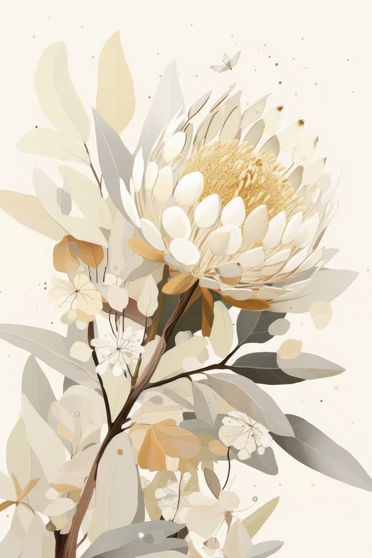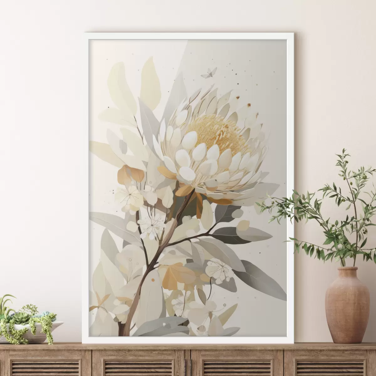 Plakatas Protea gėlė švelniai smėlio spalvos paletėje, gėlių abstrakcija f40819