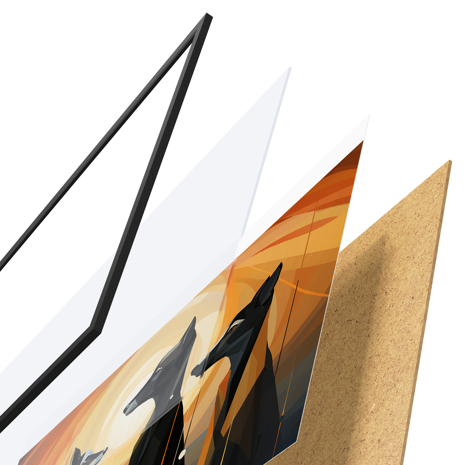 Plakatą sudaro rėmas, pleksiklas, atspausdintas vaizdas ir medžio drožlių plokštės pagrindas. Plakatą galima iš karto pakabinti ant sienos dėl kitoje pusėje esančių laikiklių.