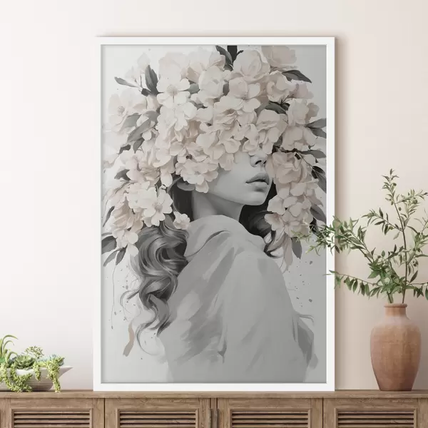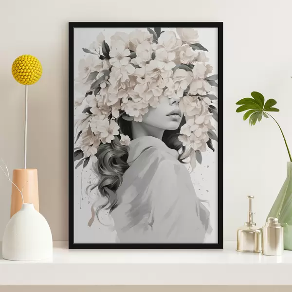 Plakatas Mergaitė su gėlėmis ant veido juodos ir baltos spalvų f40849