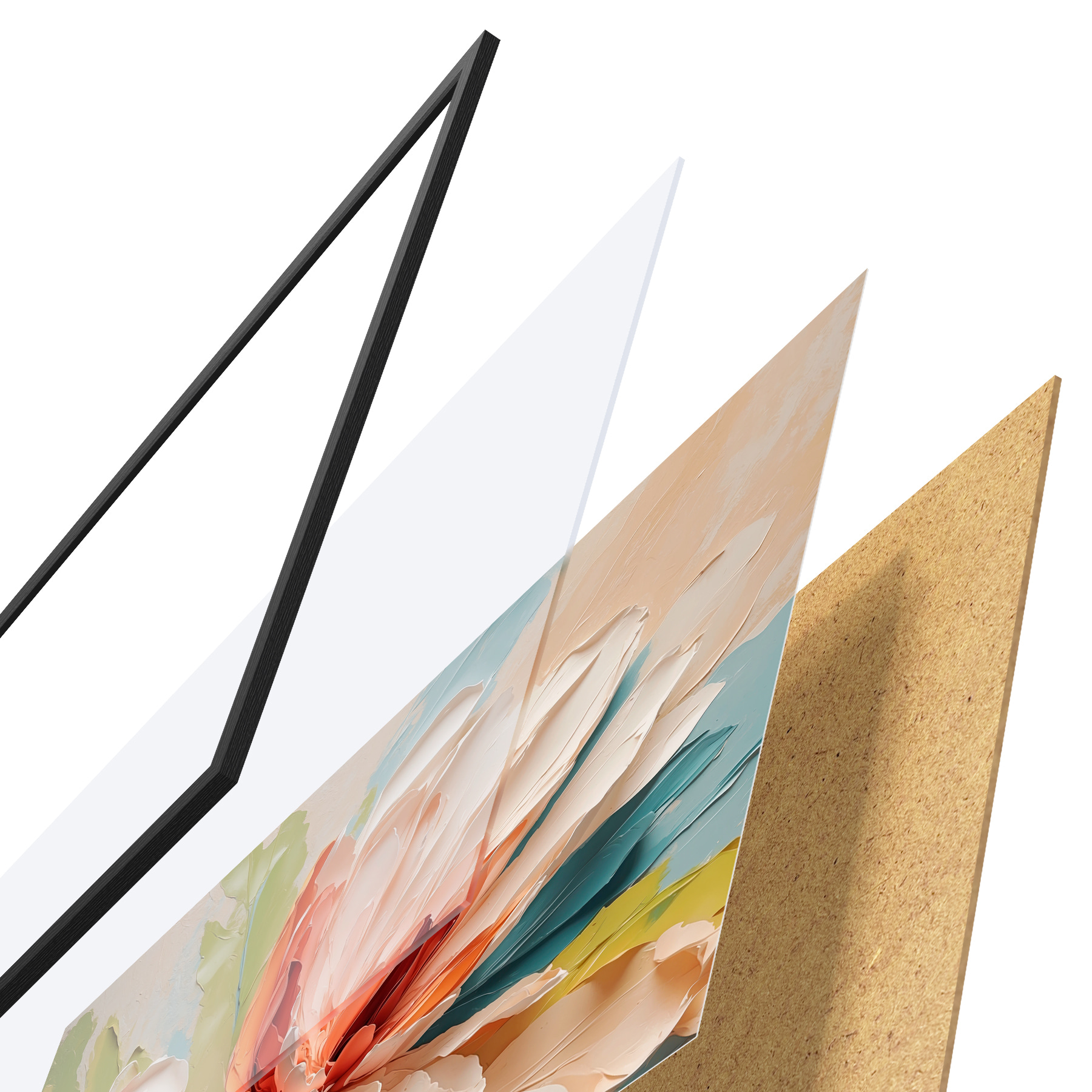 Plakatą sudaro rėmas, pleksiklas, atspausdintas vaizdas ir medžio drožlių plokštės pagrindas. Plakatą galima iš karto pakabinti ant sienos dėl kitoje pusėje esančių laikiklių.