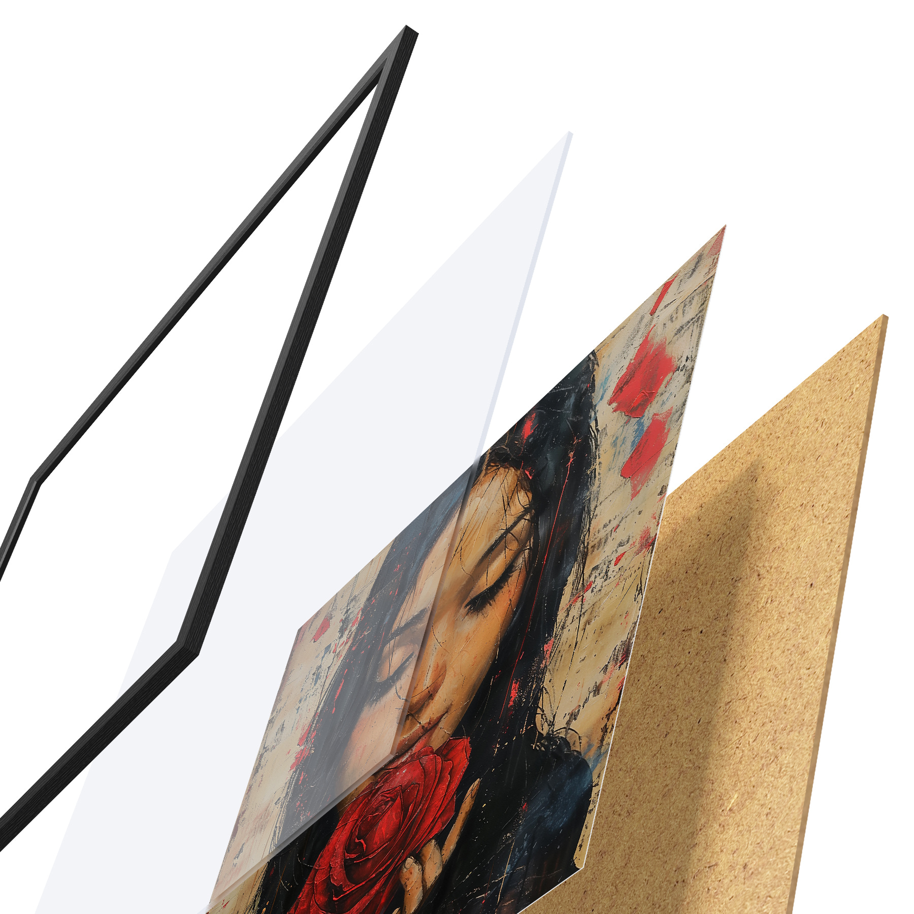 Plakatą sudaro rėmas, pleksiklas, atspausdintas vaizdas ir medžio drožlių plokštės pagrindas. Plakatą galima iš karto pakabinti ant sienos dėl kitoje pusėje esančių laikiklių.