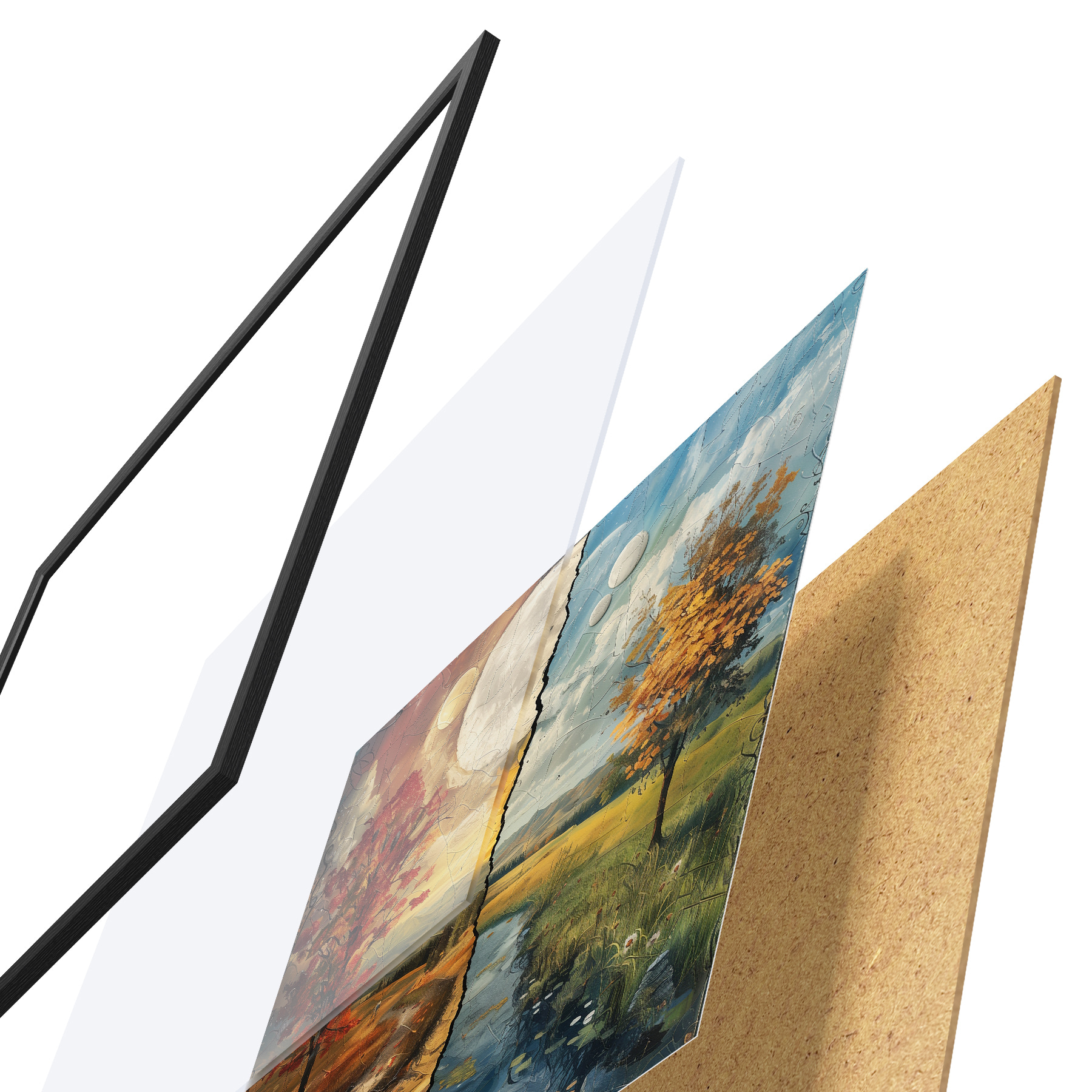 Plakatą sudaro rėmas, pleksiklas, atspausdintas vaizdas ir medžio drožlių plokštės pagrindas. Plakatą galima iš karto pakabinti ant sienos dėl kitoje pusėje esančių laikiklių.