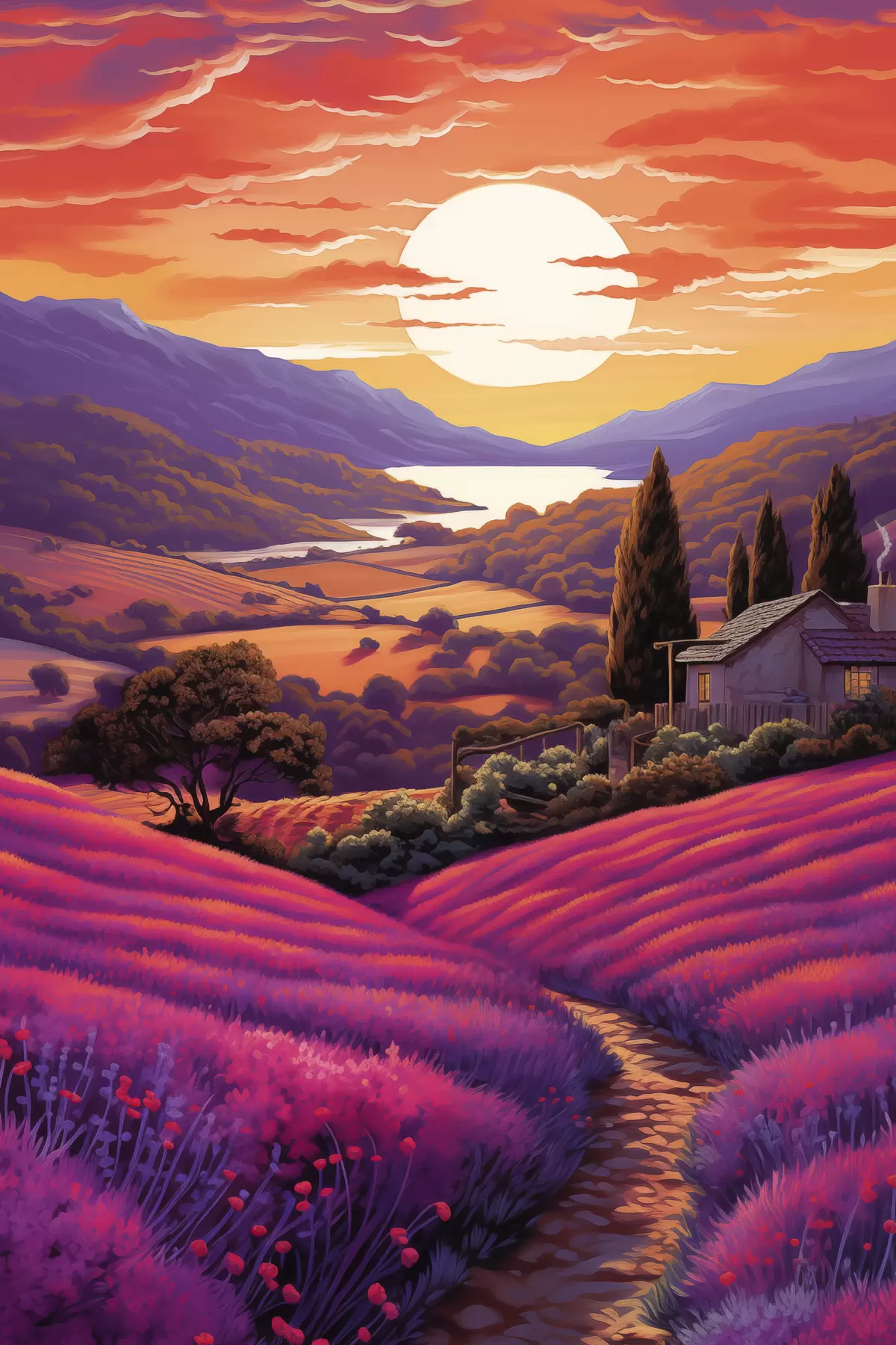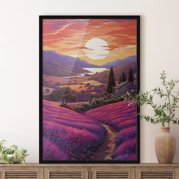 Plakatas Levandų laukai, saulėlydis, gražūs kraštovaizdžiai, kalnai Ne f40943
