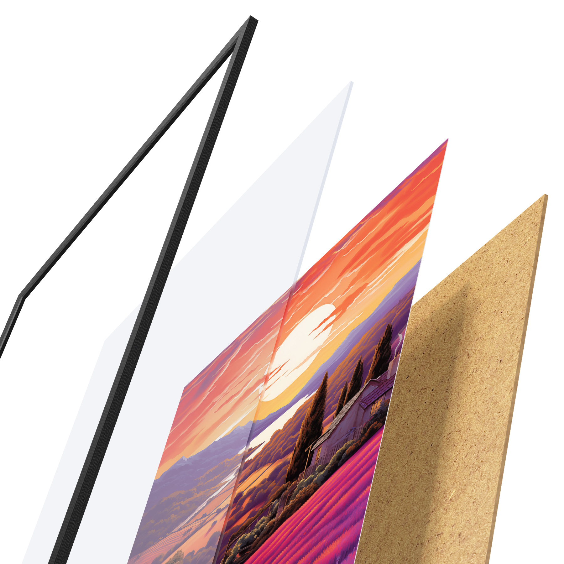 Plakatą sudaro rėmas, pleksiklas, atspausdintas vaizdas ir medžio drožlių plokštės pagrindas. Plakatą galima iš karto pakabinti ant sienos dėl kitoje pusėje esančių laikiklių.