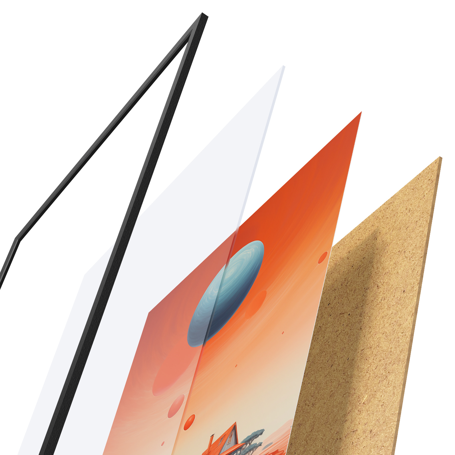 Plakatą sudaro rėmas, pleksiklas, atspausdintas vaizdas ir medžio drožlių plokštės pagrindas. Plakatą galima iš karto pakabinti ant sienos dėl kitoje pusėje esančių laikiklių.