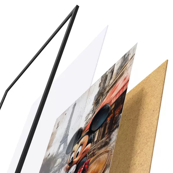 Plakatą sudaro rėmas, pleksiklas, atspausdintas vaizdas ir medžio drožlių plokštės pagrindas. Plakatą galima iš karto pakabinti ant sienos dėl kitoje pusėje esančių laikiklių.