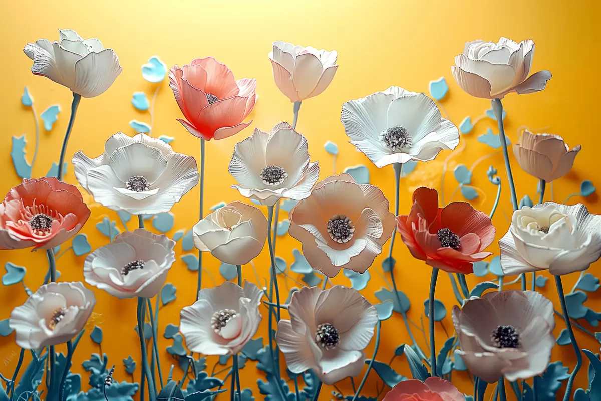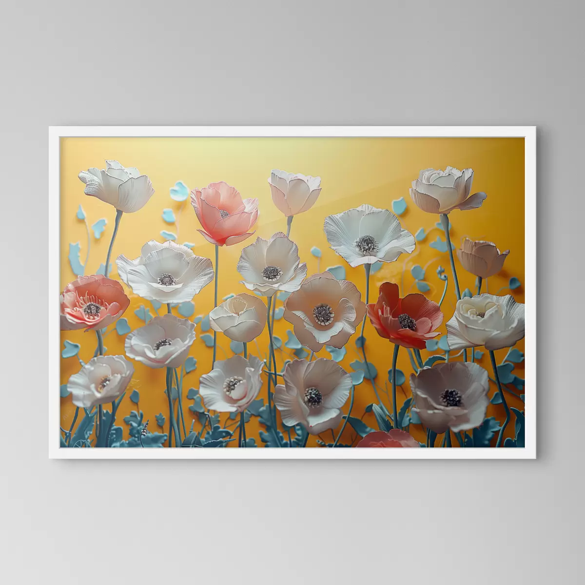 Plakatas Balti ir raudoni bijūnai geltoname fone f40975