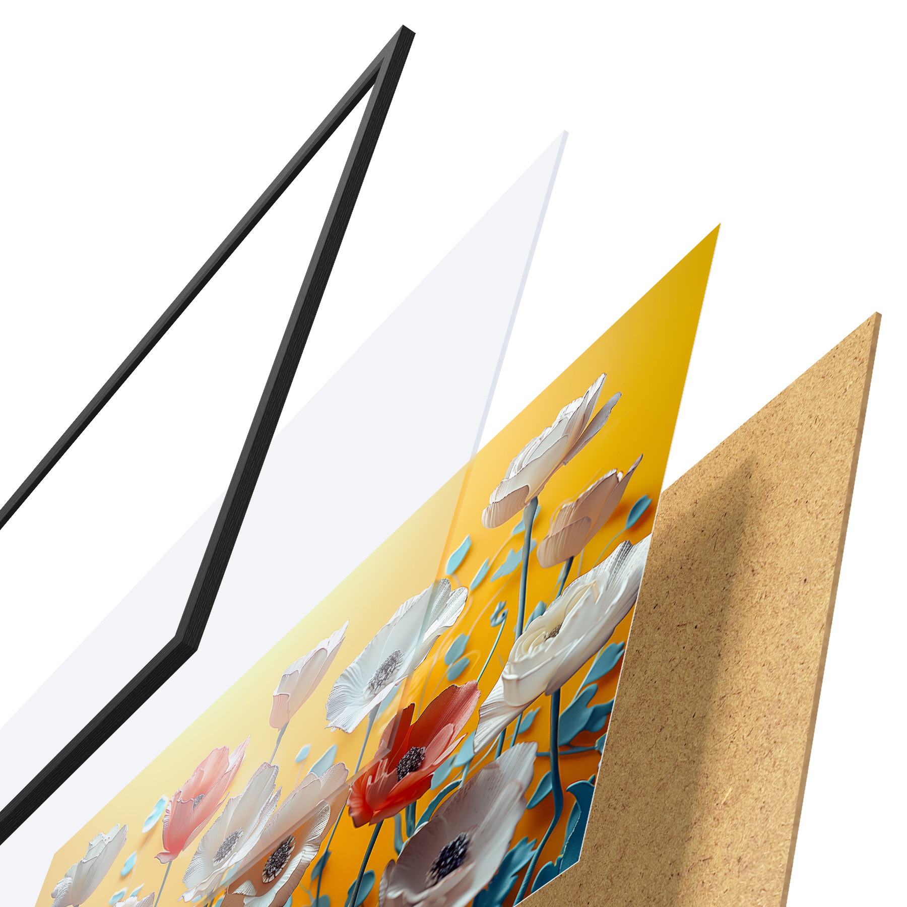 Plakatą sudaro rėmas, pleksiklas, atspausdintas vaizdas ir medžio drožlių plokštės pagrindas. Plakatą galima iš karto pakabinti ant sienos dėl kitoje pusėje esančių laikiklių.