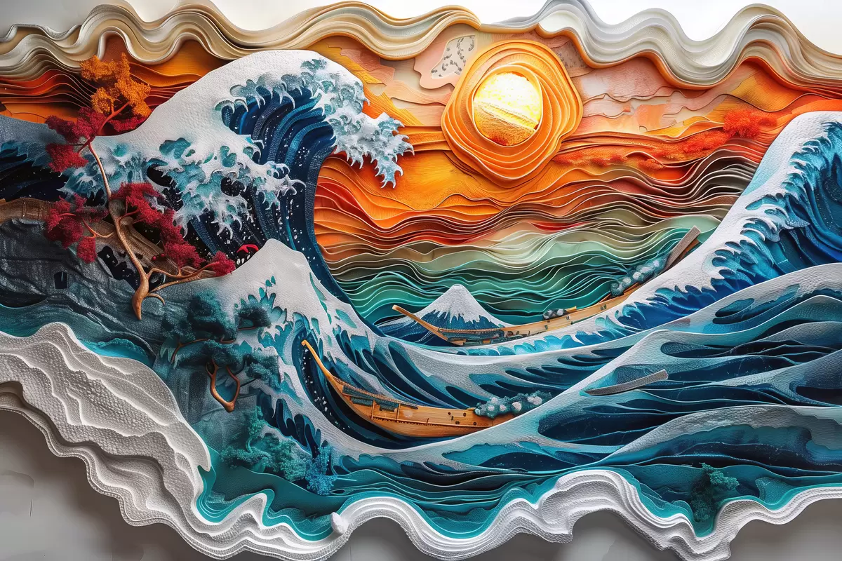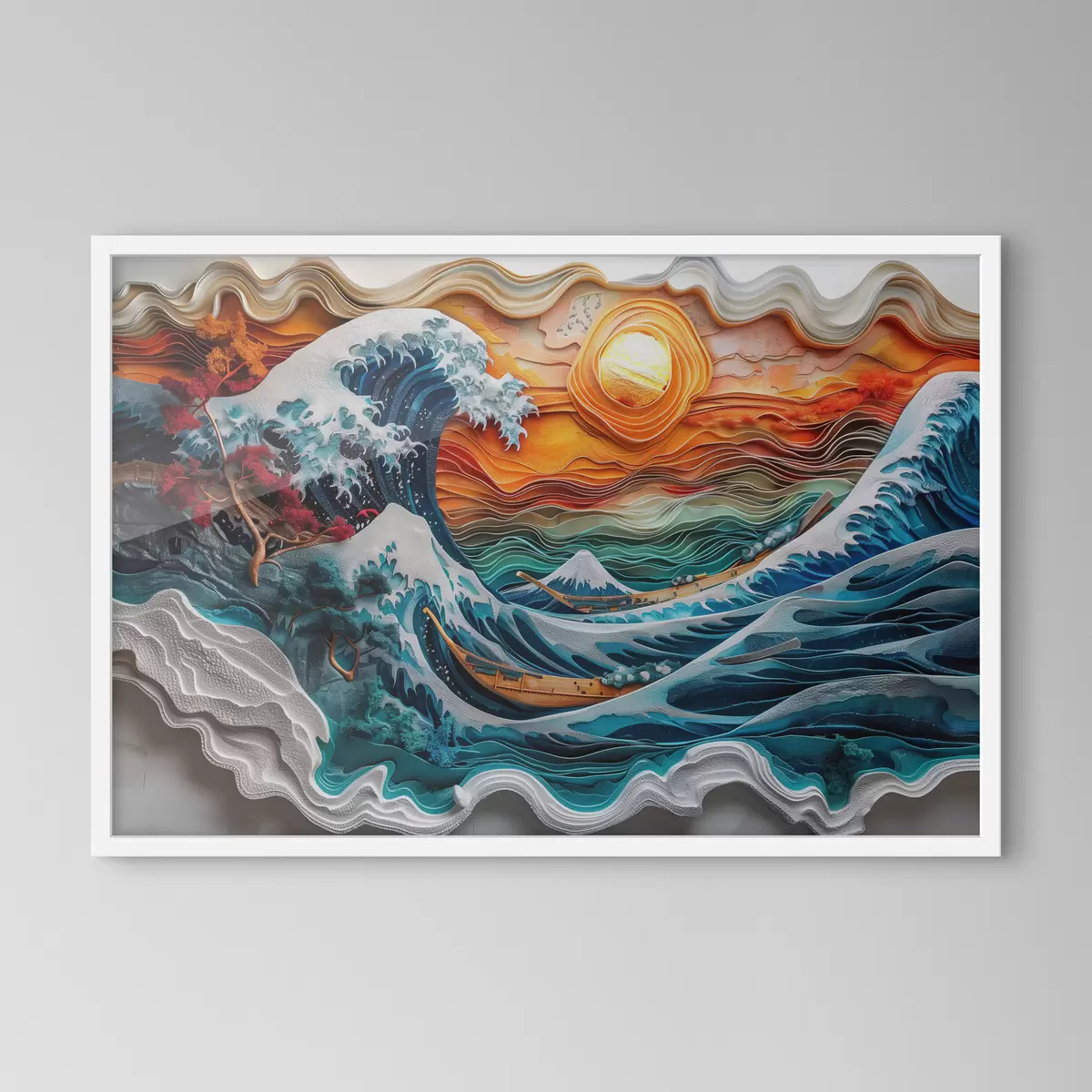 Plakatas Bareljefo imitacija: šėlstantis vandenynas su valtimis ir saule f40976