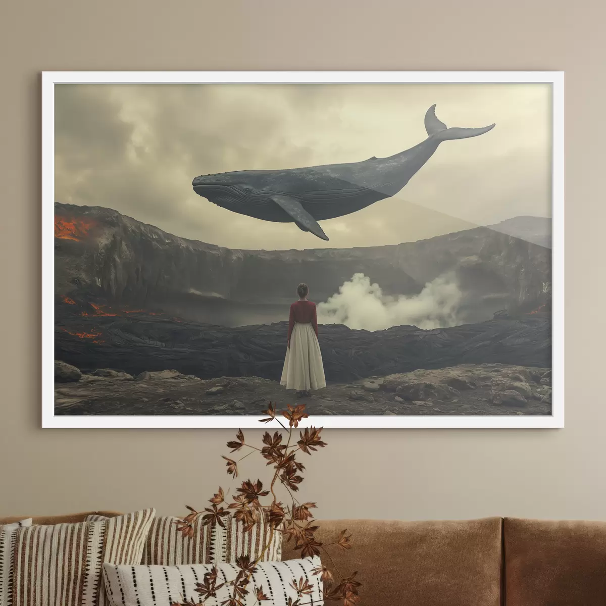 Plakatas Mergina ant lavos su dideliu skraidančiu banginiu danguje f40986