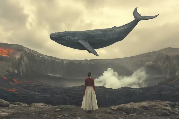 Plakatas Mergina ant lavos su dideliu skraidančiu banginiu danguje f40986