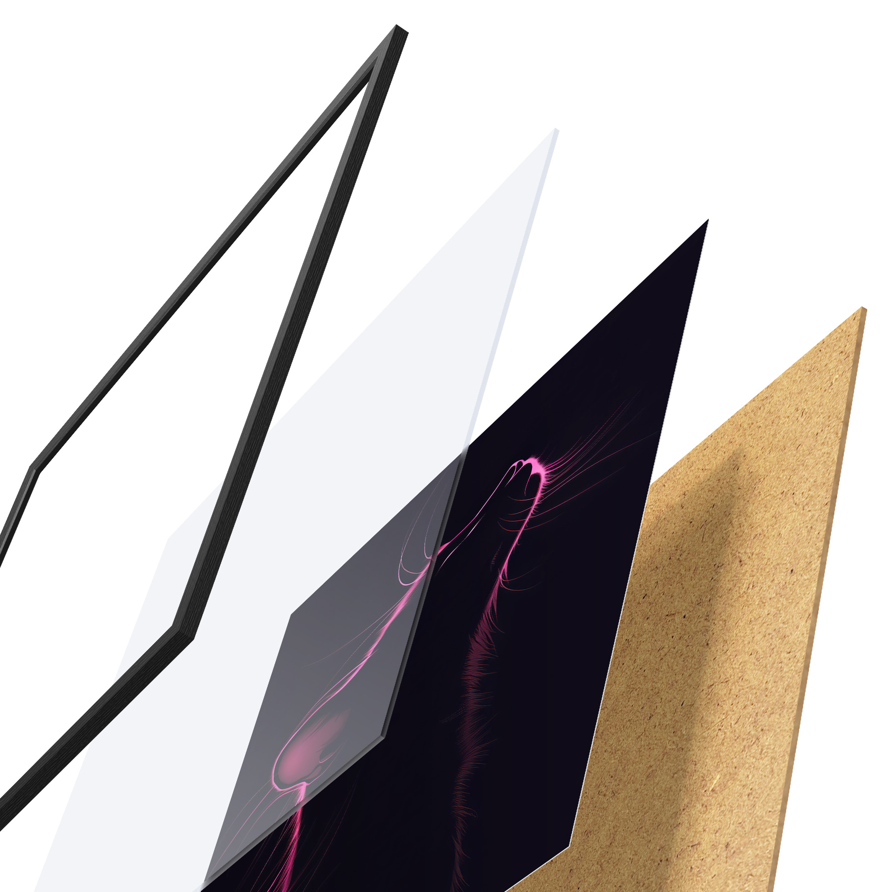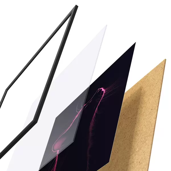 Plakatą sudaro rėmas, pleksiklas, atspausdintas vaizdas ir medžio drožlių plokštės pagrindas. Plakatą galima iš karto pakabinti ant sienos dėl kitoje pusėje esančių laikiklių.