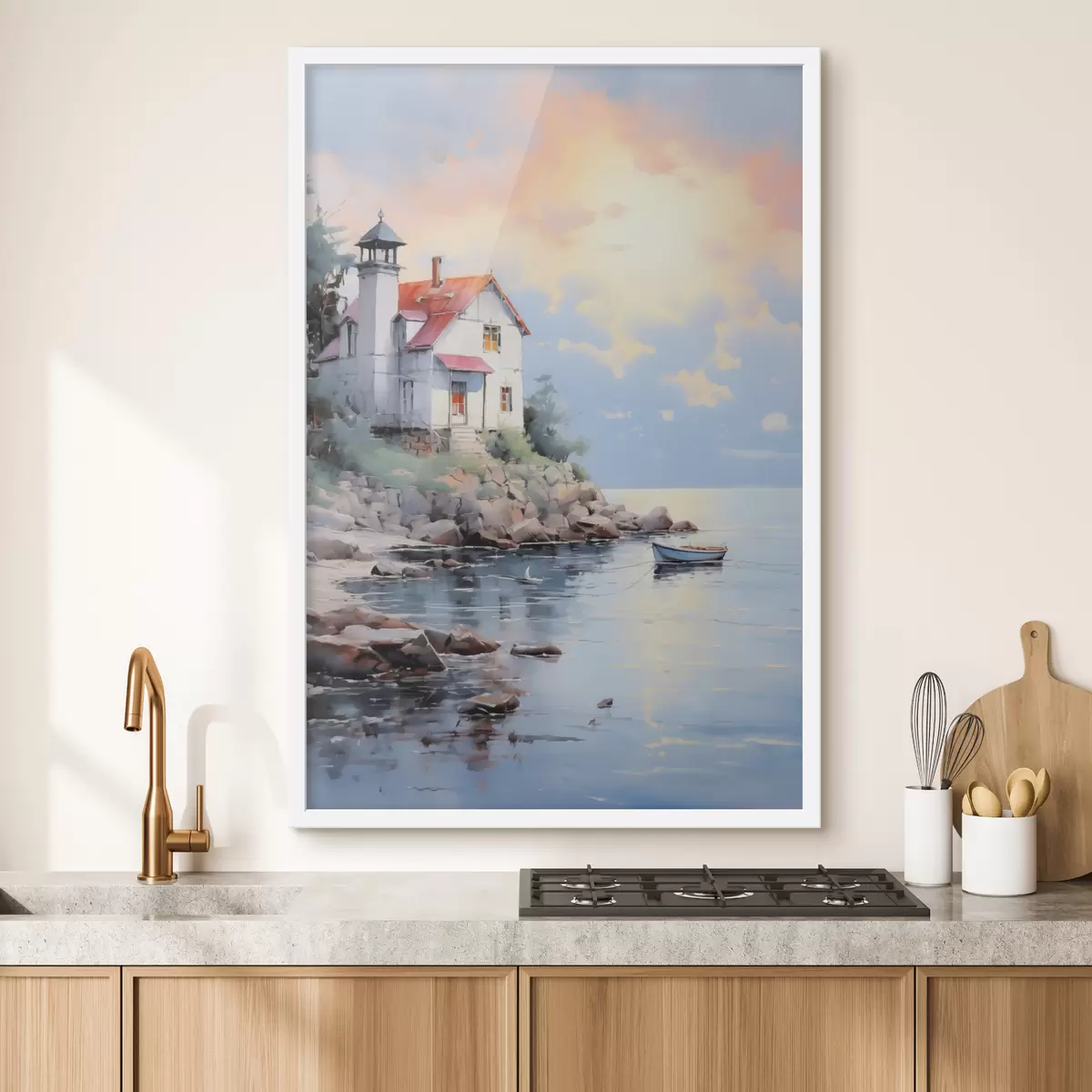 Plakatas Namas paplūdimyje prie jūros saulėlydžio metu f41010