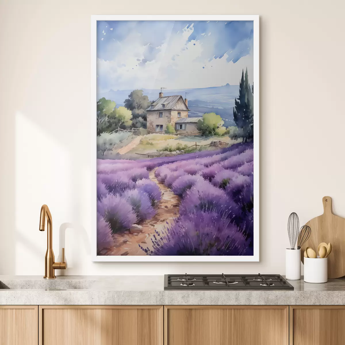 Plakatas Kaimo namas su kalnais fone šalia levandų lauko Ne f41012