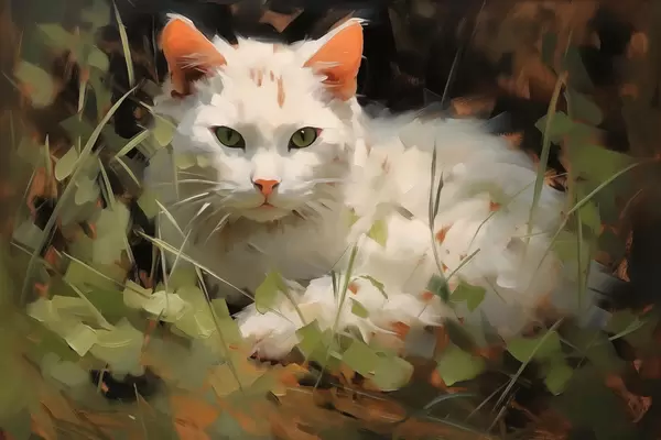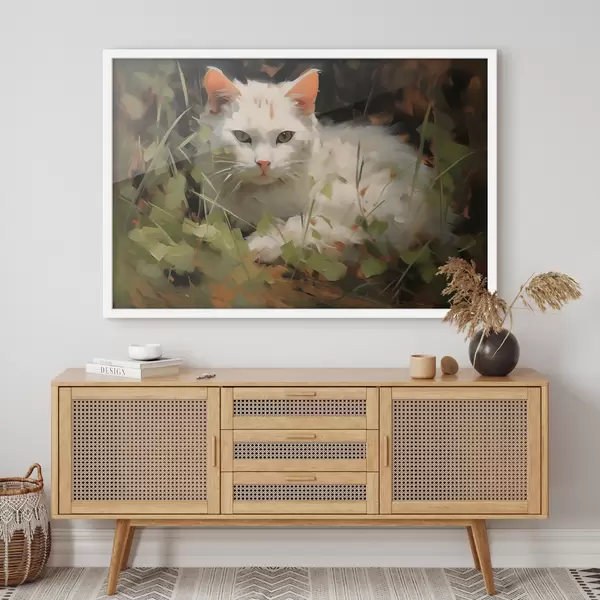 Plakatas Balta katė, gulinti žolėje, imituojanti tapybos teptuko potėpius f41017