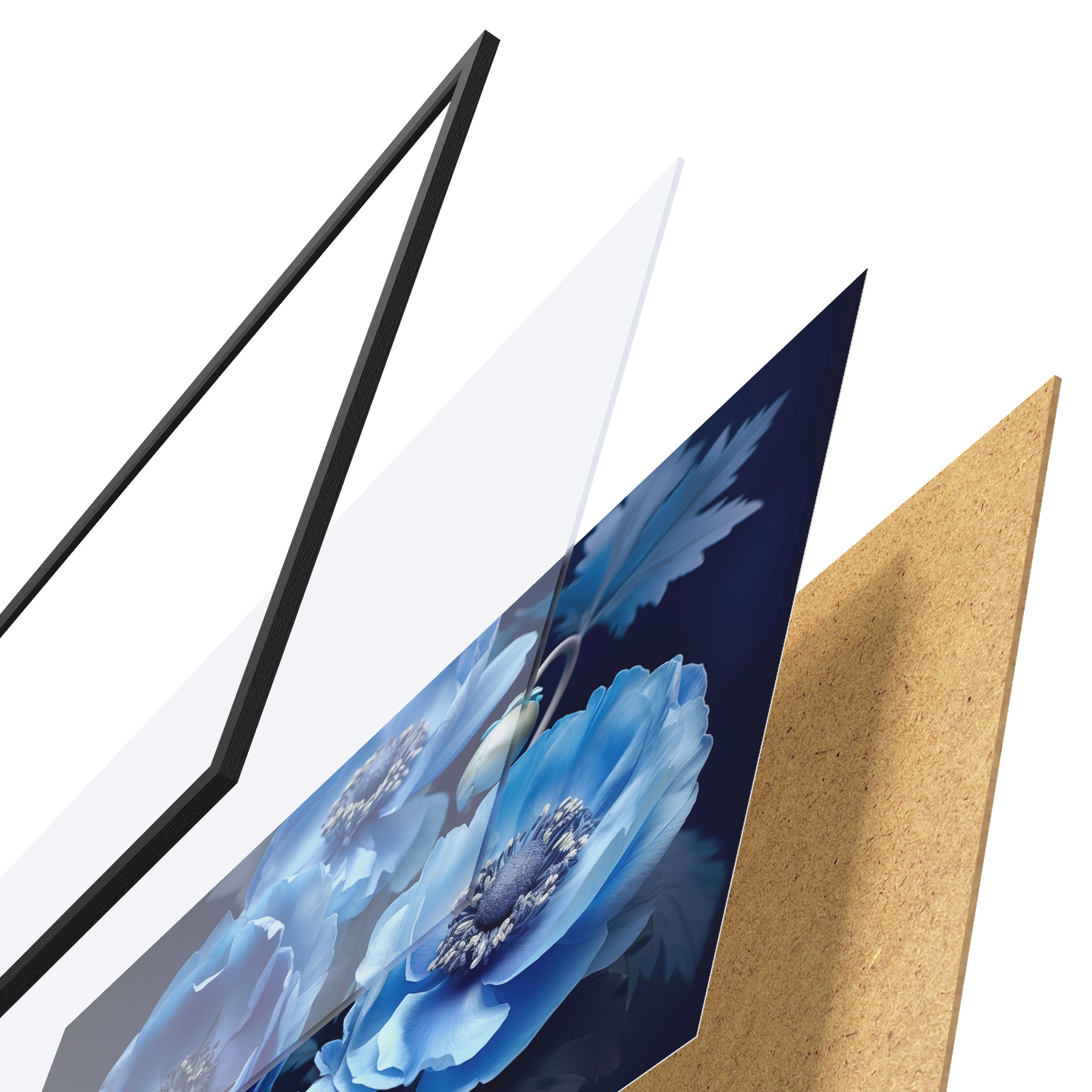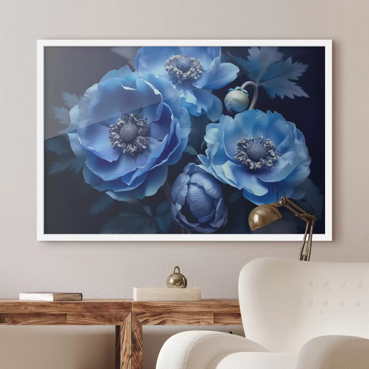 Plakatas Didelės mėlynos gėlės tamsiame fone f41020