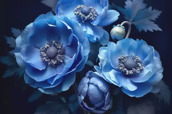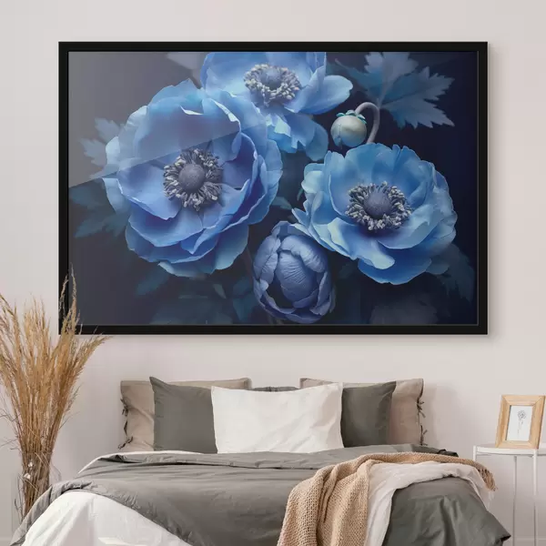 Plakatas Didelės mėlynos gėlės tamsiame fone f41020