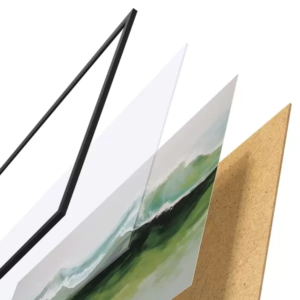 Plakatą sudaro rėmas, pleksiklas, atspausdintas vaizdas ir medžio drožlių plokštės pagrindas. Plakatą galima iš karto pakabinti ant sienos dėl kitoje pusėje esančių laikiklių.