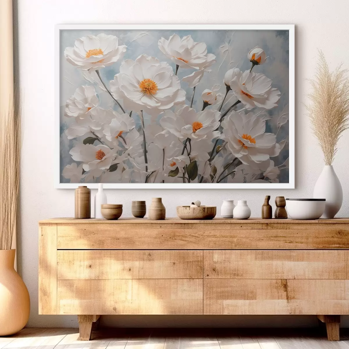 Plakatas Baltos gėlės mėlyname-baltame aliejiniame fone f41041