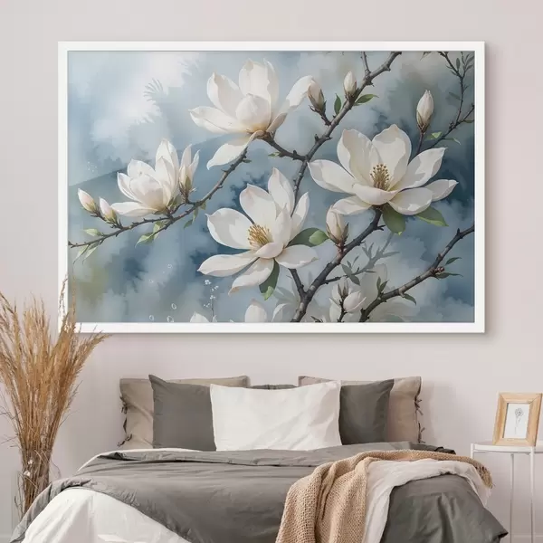 Plakatas Baltos magnolijos gėlės žydi ant medžių šakų minkštame akvareliniame mėlyno dangaus fone Ne f41081