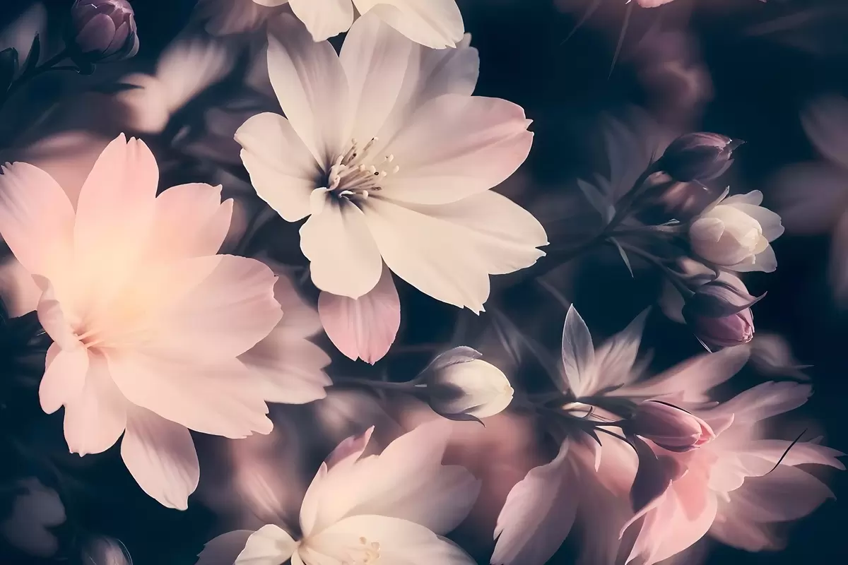 Plakatas Minkštos rožinės ir baltos spalvos senovinės lengvos gėlės su neryškiu fonu f41084