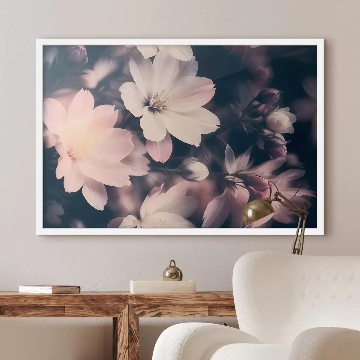 Plakatas Minkštos rožinės ir baltos spalvos senovinės lengvos gėlės su neryškiu fonu Ne f41084
